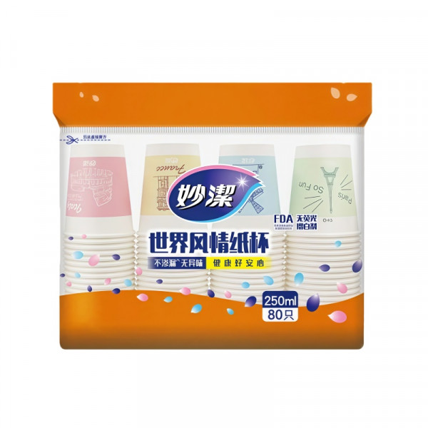 (世星阳光)妙洁 一次性纸杯子 咖啡杯商务杯世界风情杯 250ml*80只 无荧光 增白剂 杯口加厚不烫嘴 纸杯杯口厚实不易变形 不易外翻