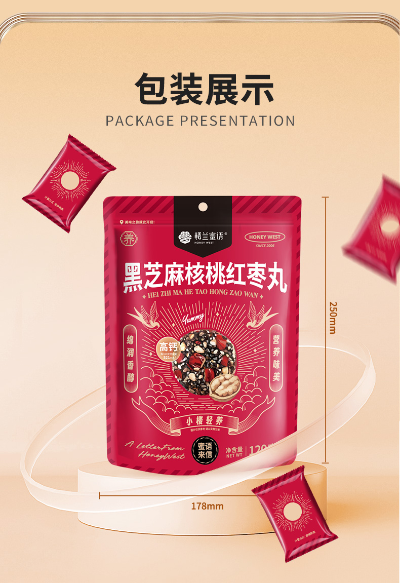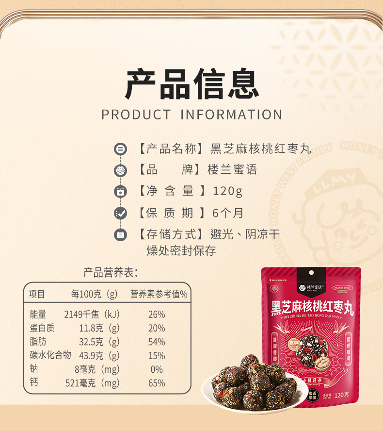 商品名称:(世星阳光)楼兰蜜语黑芝麻核桃红枣丸120g*2袋