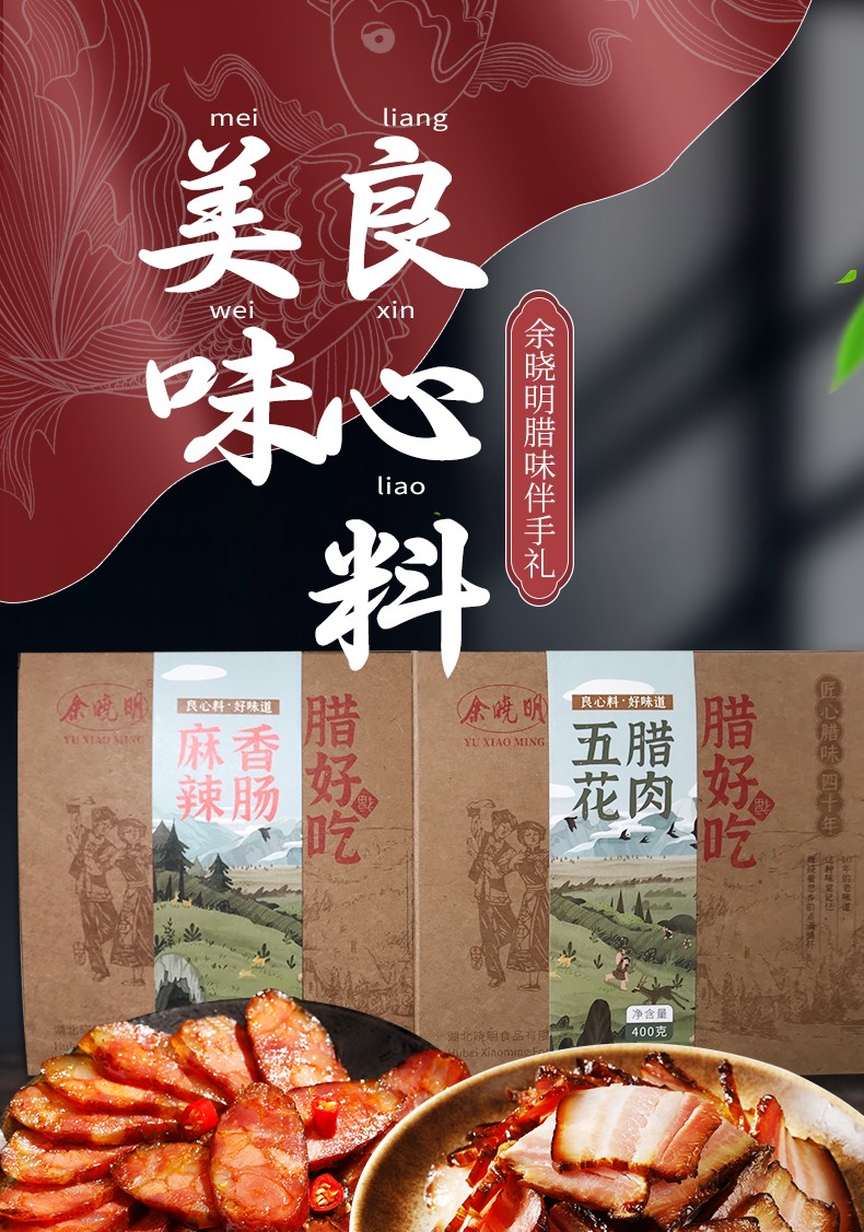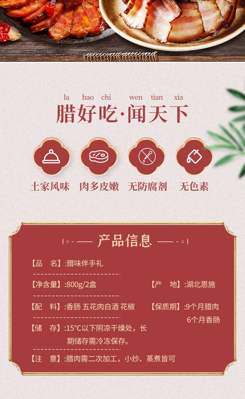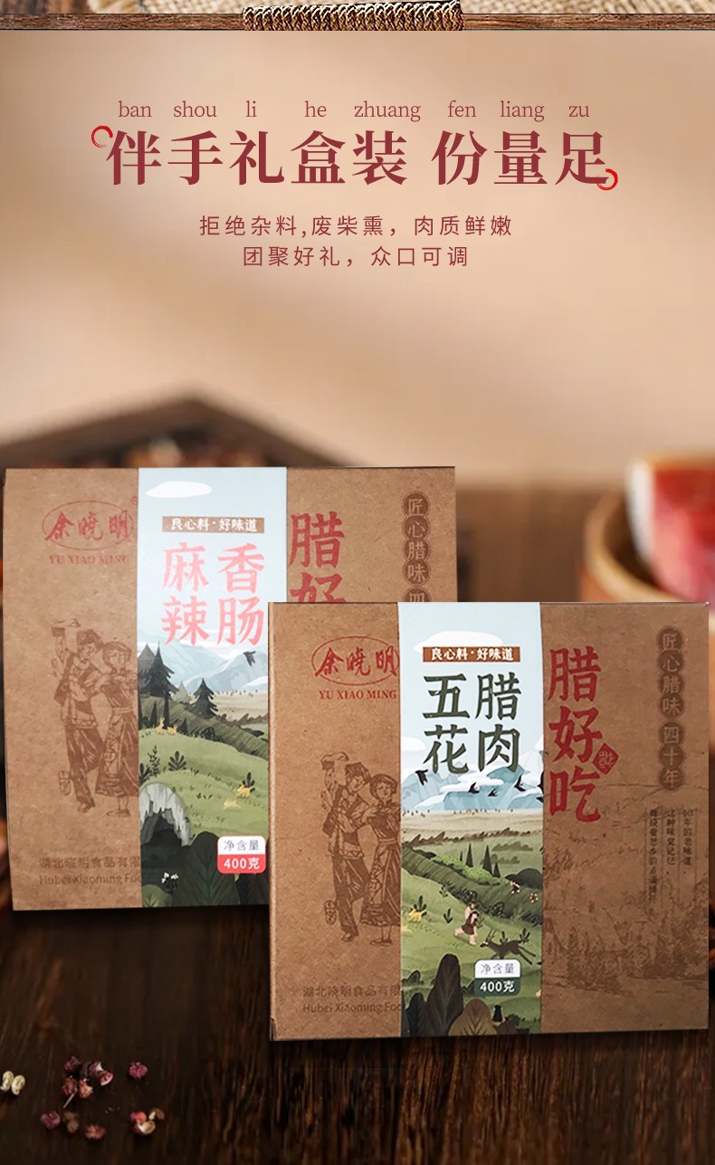 商品名称:(世星阳光) 余晓明腊味伴手礼(腊肠+腊肉精选组合2盒装800g)800g 恩施特产 40年匠心制作 拒绝冷冻肉 拒绝碎肉边角料 不肥不腻 腊香四溢