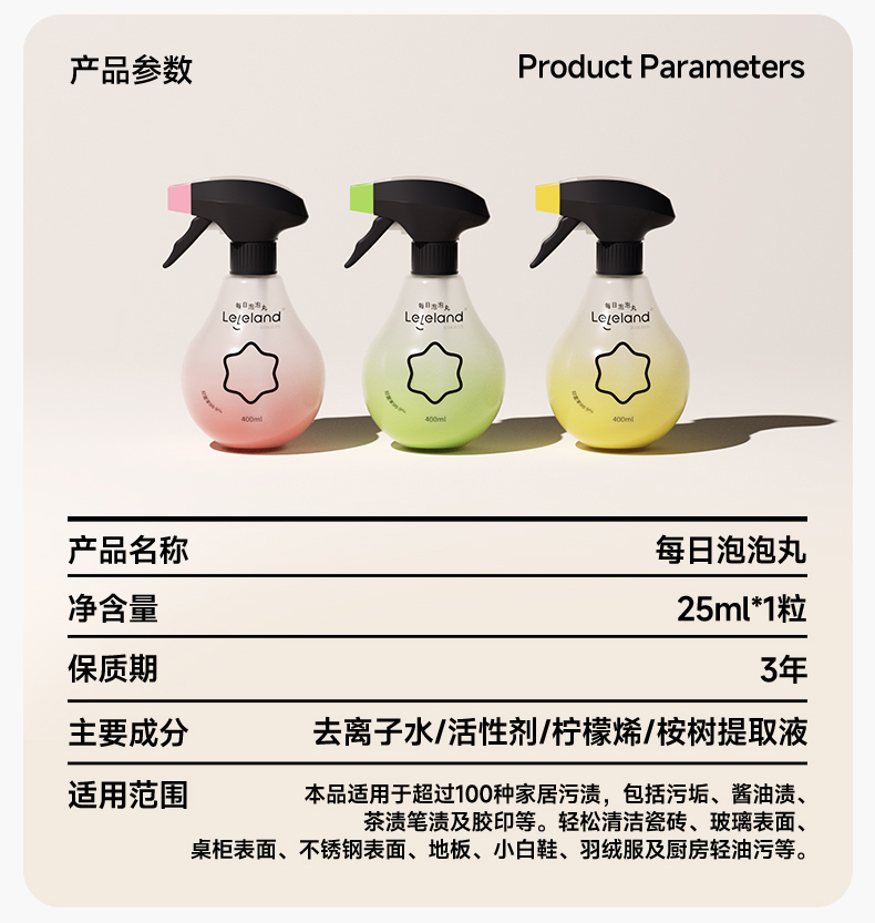商品名称:(汇景缘)乐乐桉多功能清洁剂(400ml空喷瓶*1 蜜桃味胶囊25ml*4)送擦擦乐*1每日泡泡丸家用厨房浴室墙面泡沫强力多效去污