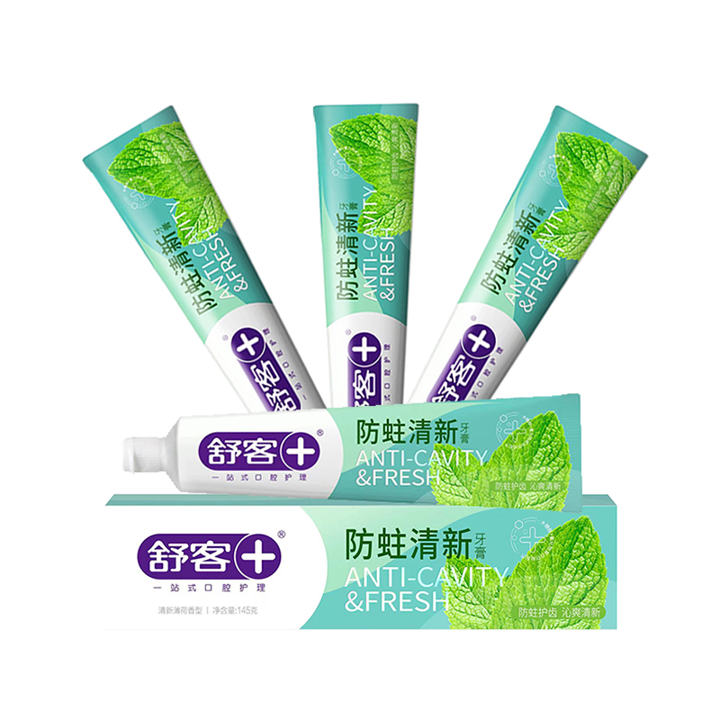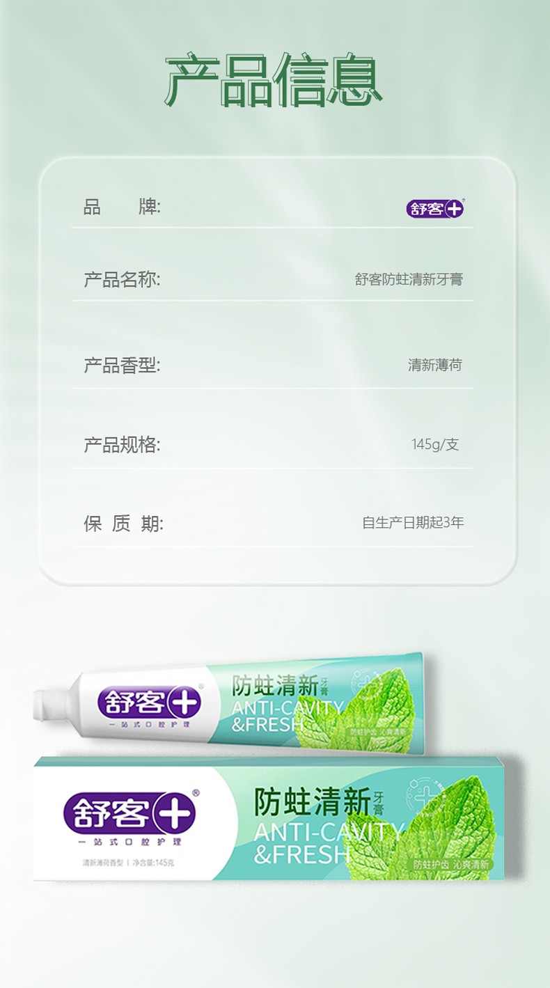 商品名称:(世星阳光)舒客防蛀清新 沁爽炫白 沁爽清新牙膏 专业护龈洁齿强烈 防蛀清新牙膏 145g*3