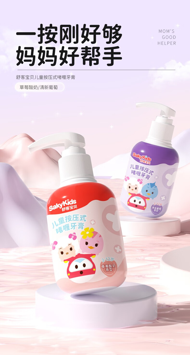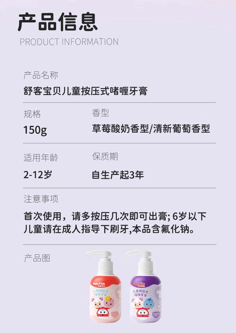 商品名称:(世星阳光)舒客臻爱儿童护理套装 ZHS-ETB21F 儿童声波电动牙刷B2粉色*1 按压式啫喱牙膏150g(清新葡萄味)*1 按压式啫喱牙膏150g(草莓酸奶味)*1 进口磨圆毛刷 智能系统