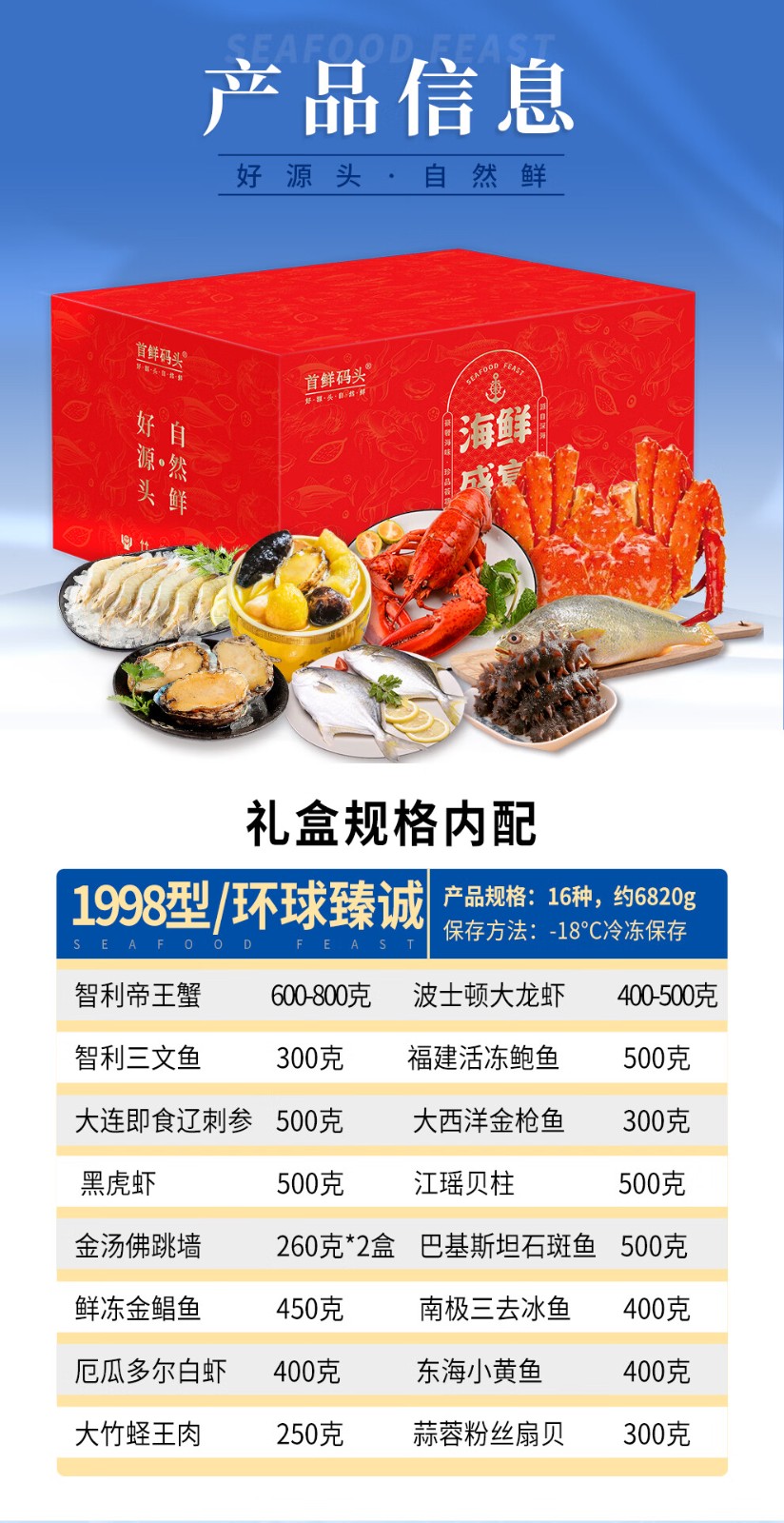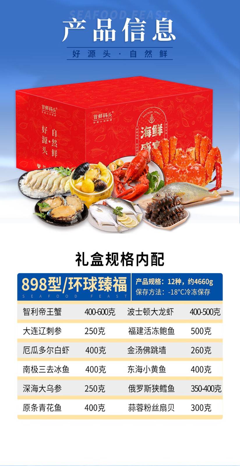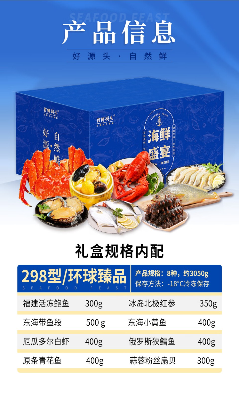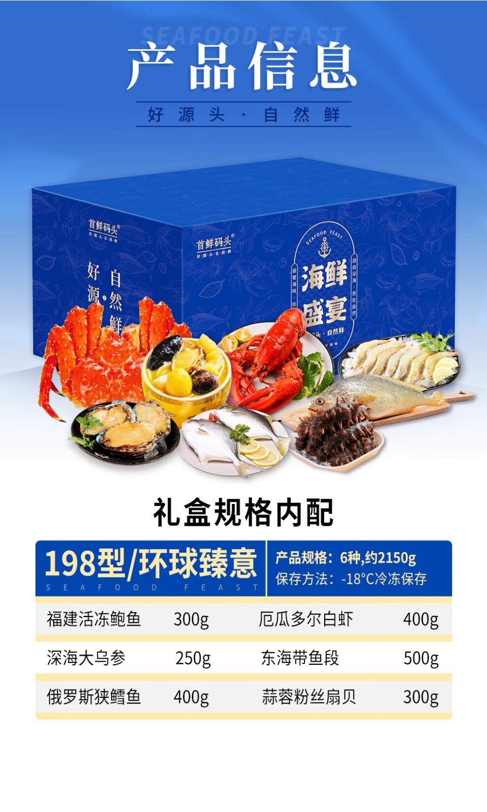 商品名称:(巨邦佑)BJ+首鲜码头 环球系列海鲜礼盒大礼包 国产海鲜鲍鱼白虾深海大乌参扇贝鳕鱼青花鱼小黄鱼