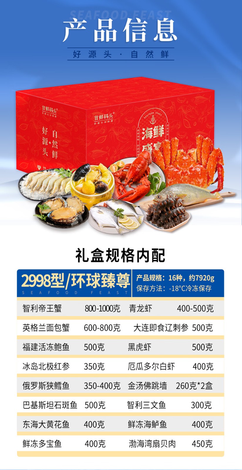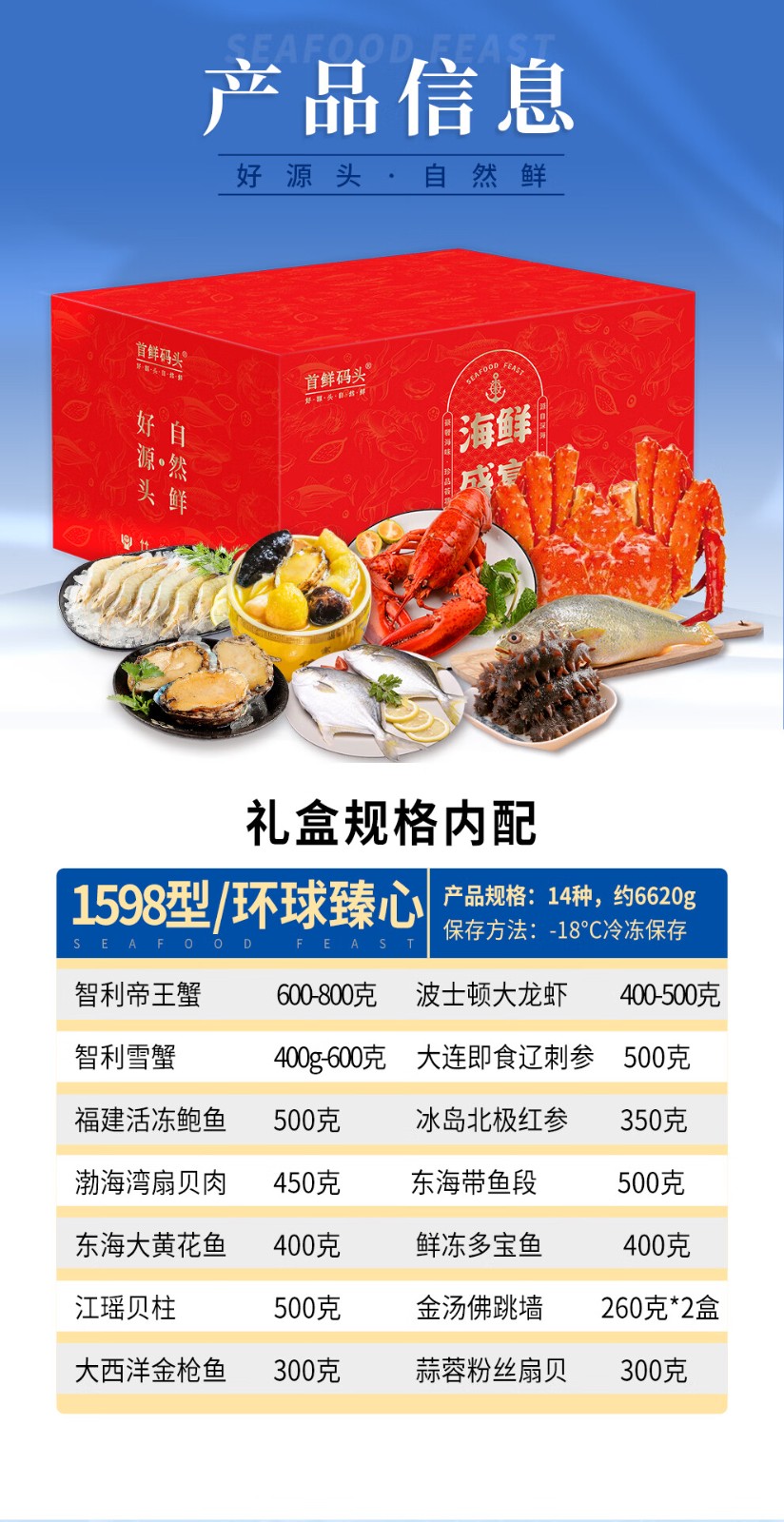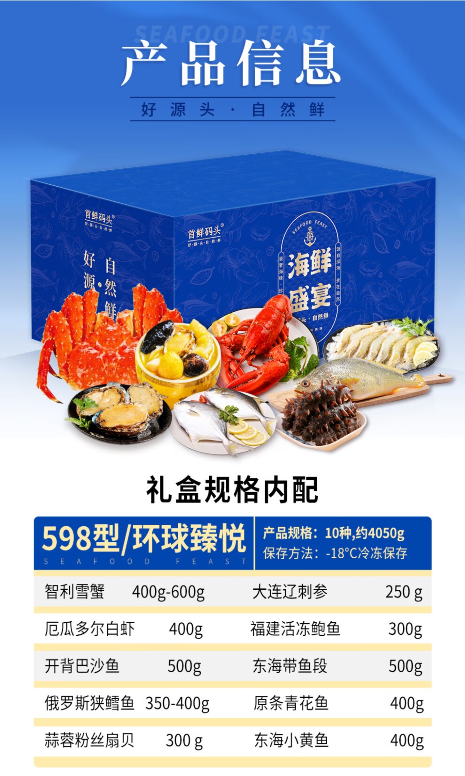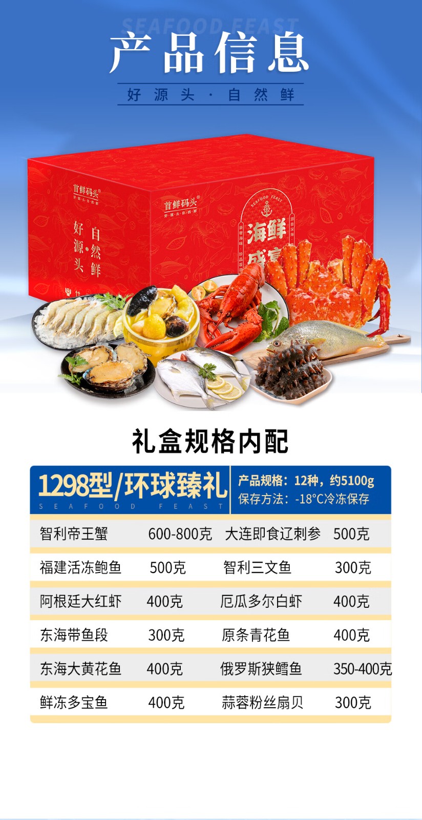 商品名称:(巨邦佑)BJ+首鲜码头 环球系列海鲜礼盒大礼包 国产海鲜鲍鱼白虾深海大乌参扇贝鳕鱼青花鱼小黄鱼