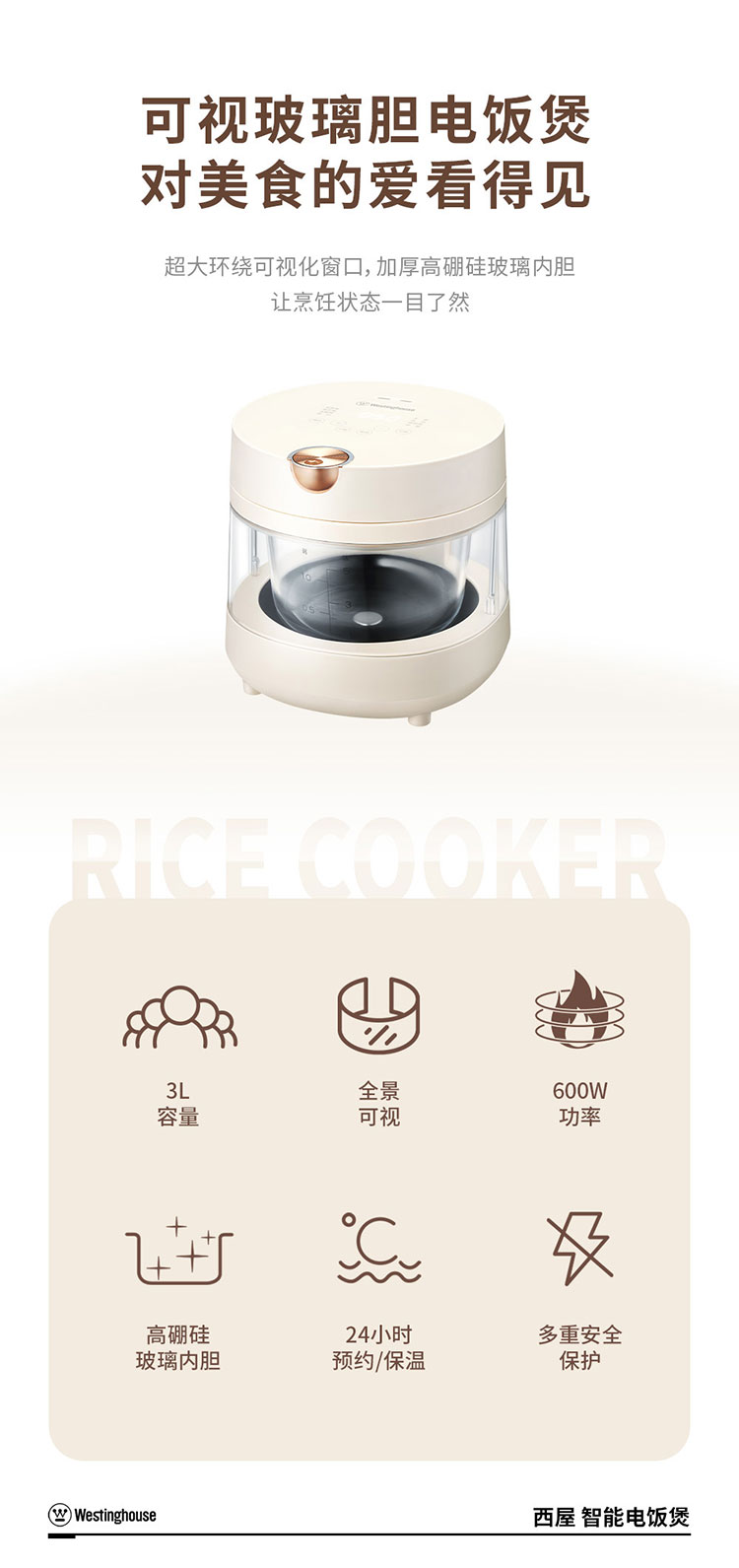 商品名称:(世星阳光)+WY西屋 智能电饭煲 3L WRC010 透明视窗 玻璃内胆 焖煮鲜炖全程可见