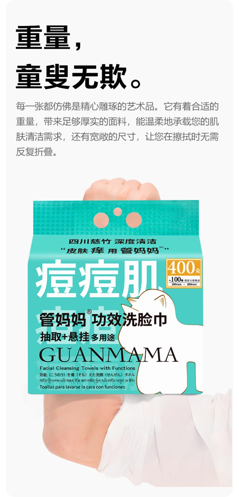 商品名称:(汇景缘)管妈妈痘痘肌400克洗脸巾 分类功效加大加厚悬挂式洁面棉柔巾祛痘加厚擦脸巾中国慈竹100抽提送挂钩