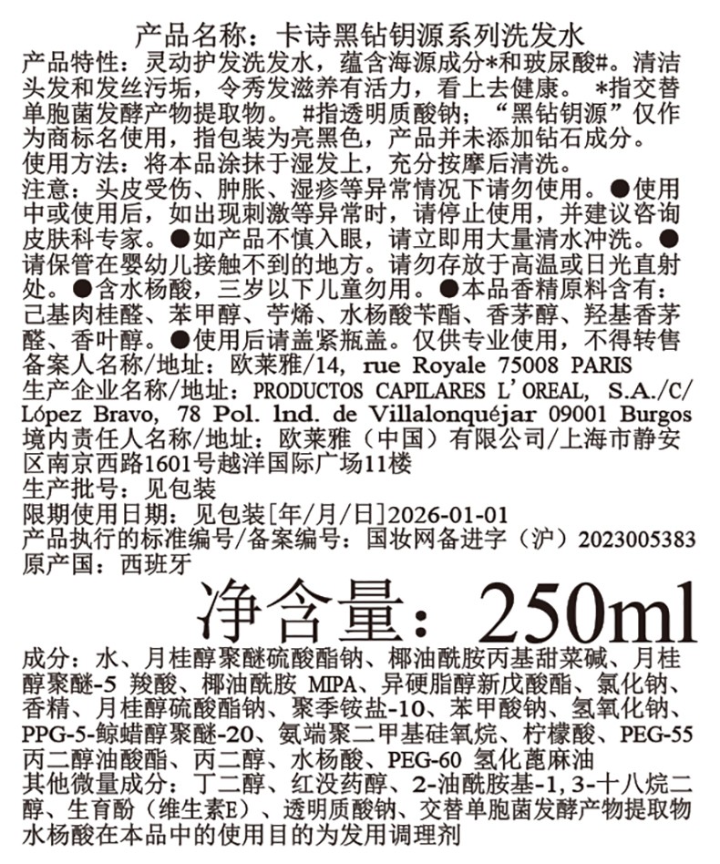 商品名称:(世星阳光)+卡诗黑钻钥源洗发水 250ml 滋养强韧水润柔顺清洁顺滑