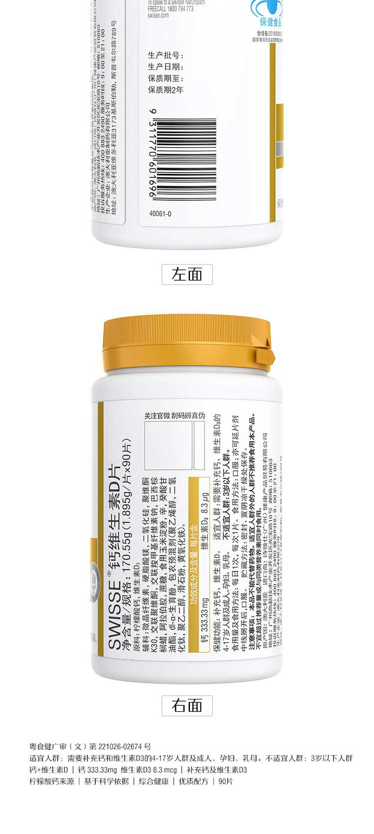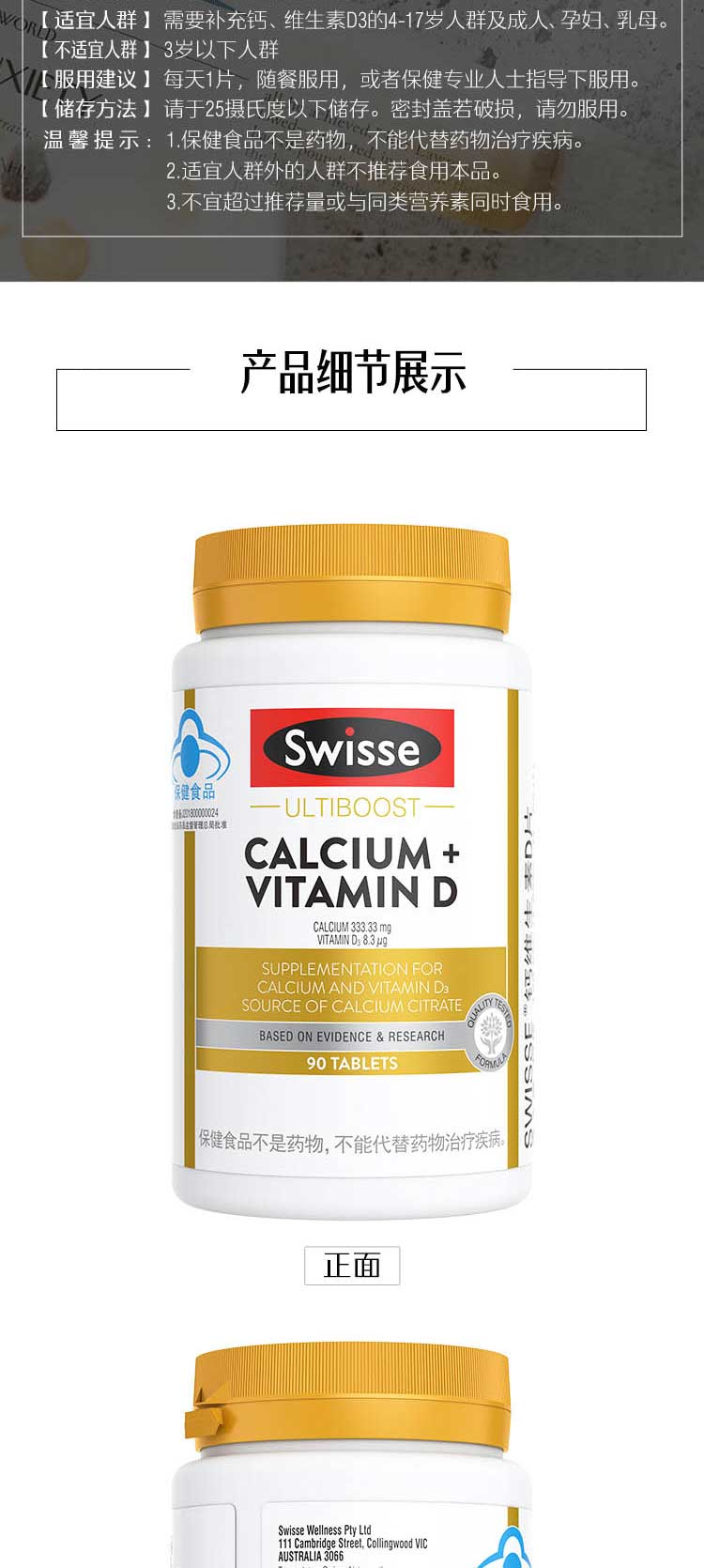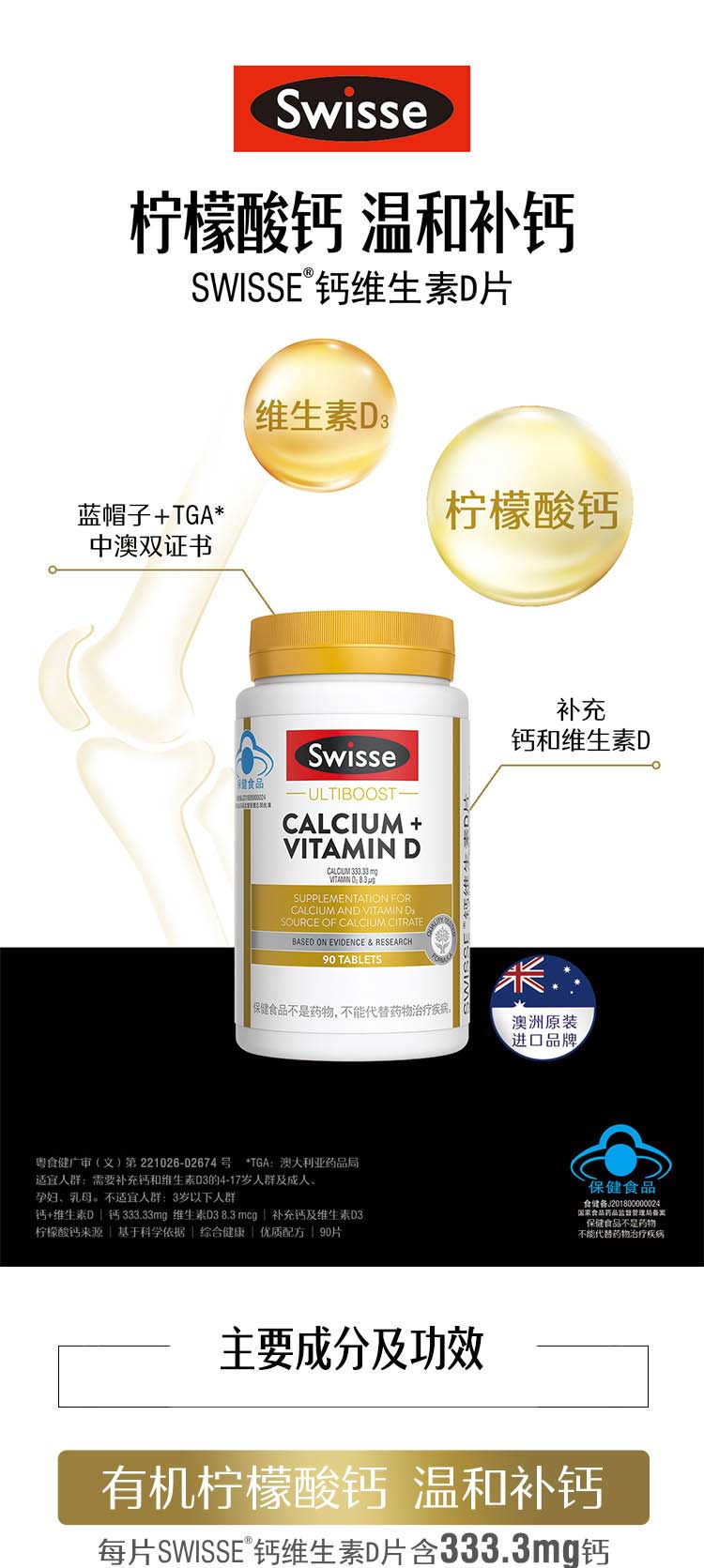 商品名称:(世星阳光)+Swisse斯维诗 钙维生素D片 90粒 柠檬酸钙好吸收 孕妇中老年人适用