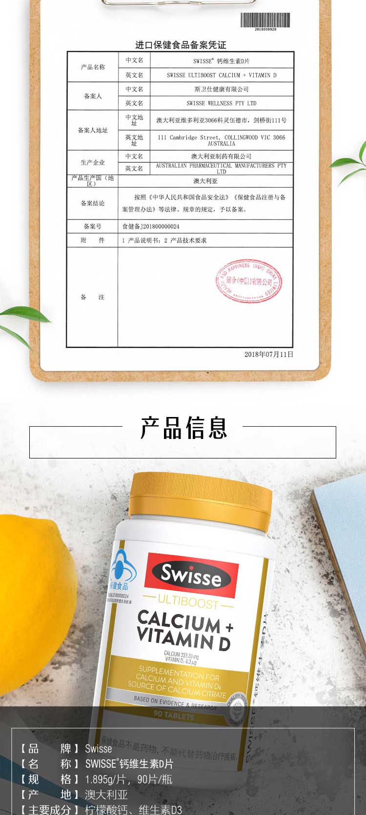 商品名称:(世星阳光)+Swisse斯维诗 成人钙片维生素D片90粒(山姆同款-原装进口) 钙维生素D片 柠檬酸钙片 每片含333.33mg钙 蓝帽认证