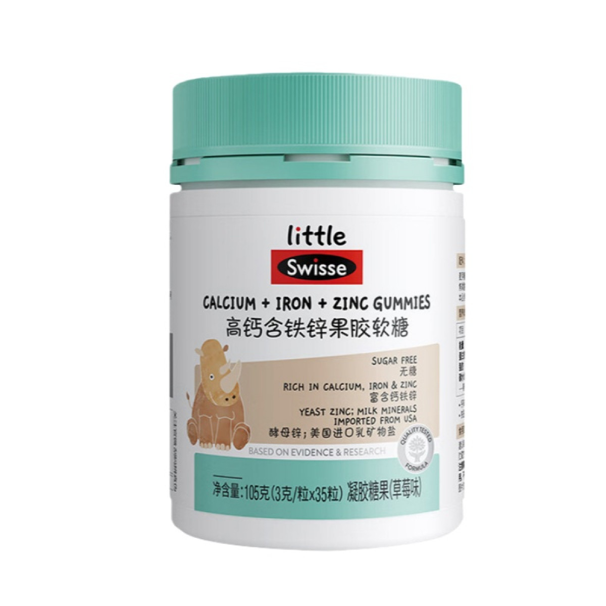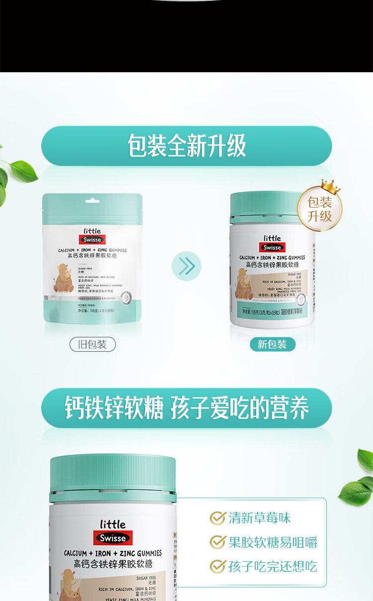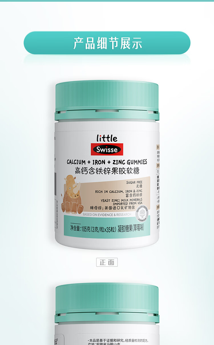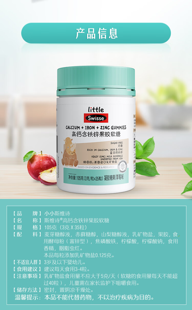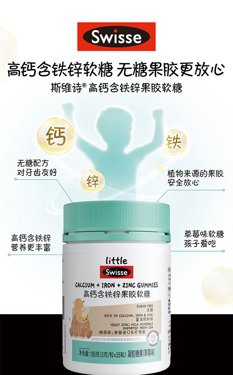 商品名称:(世星阳光)+Swisse斯维诗 高钙含铁锌果胶软糖 105克(3克 x 35粒)草莓味 高钙含铁锌软糖 呵护骨骼牙齿健康 3岁+儿童适用