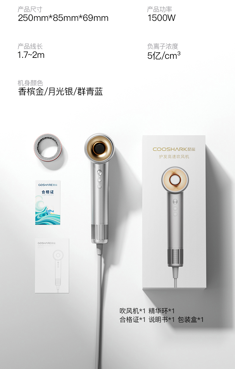 商品名称:(世星阳光)+酷鲨 高速吹风机HD10 护发吹风机 速干无叶 便携大风量 负离子低噪