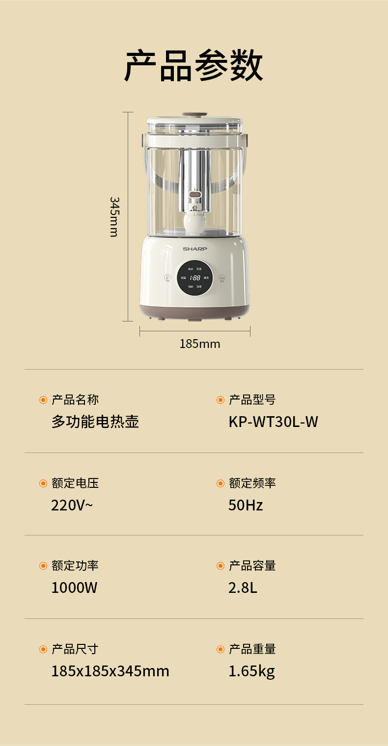 商品名称:(巨邦佑)BJ+夏普 多功能电热壶 2.8L KP-WT30L-W 花茶水果茶煮茶器煮茶壶