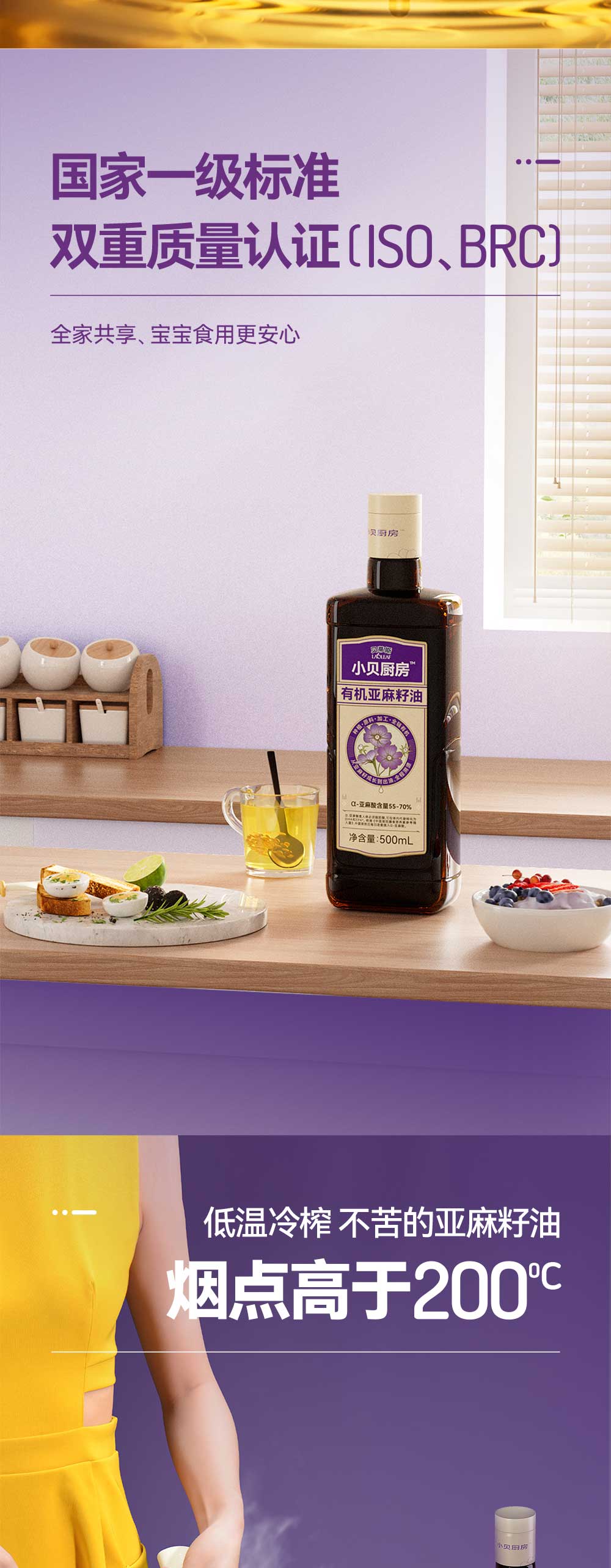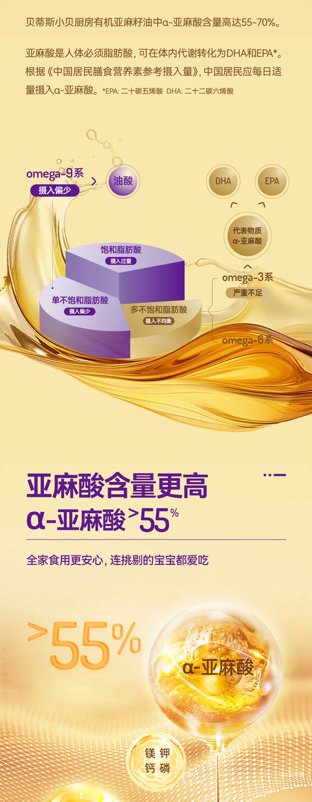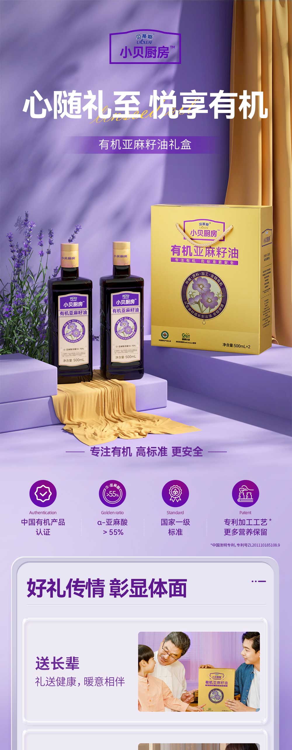 商品名称:(世星阳光)+贝蒂斯 小贝厨房有机亚麻籽油 500ml*2礼盒 赠送价值49.9元有机亚麻籽油125ml*1瓶 国家一级标准 亚麻酸大于55% 进口产区