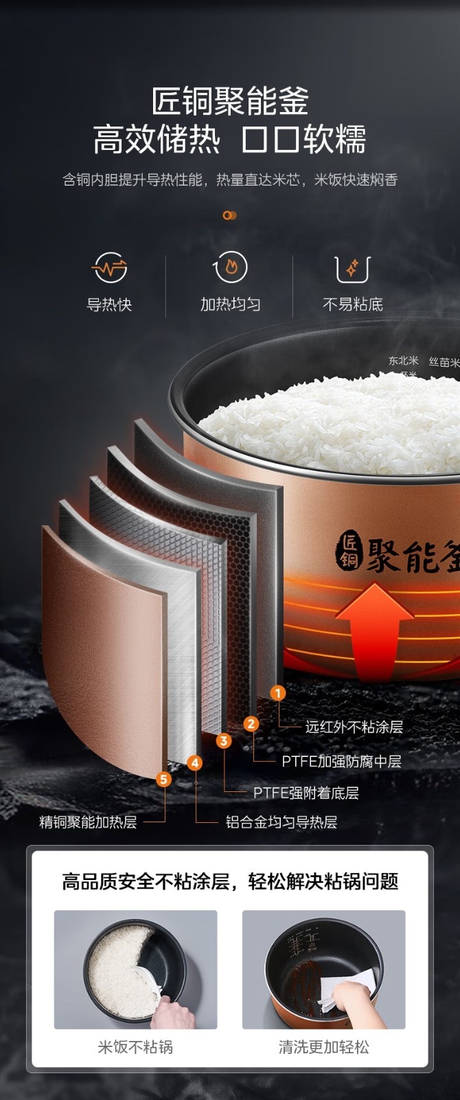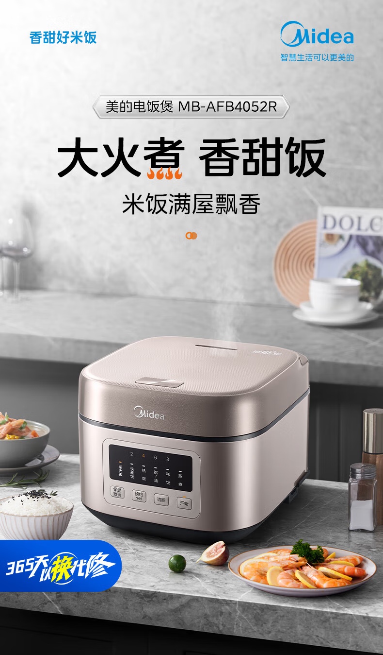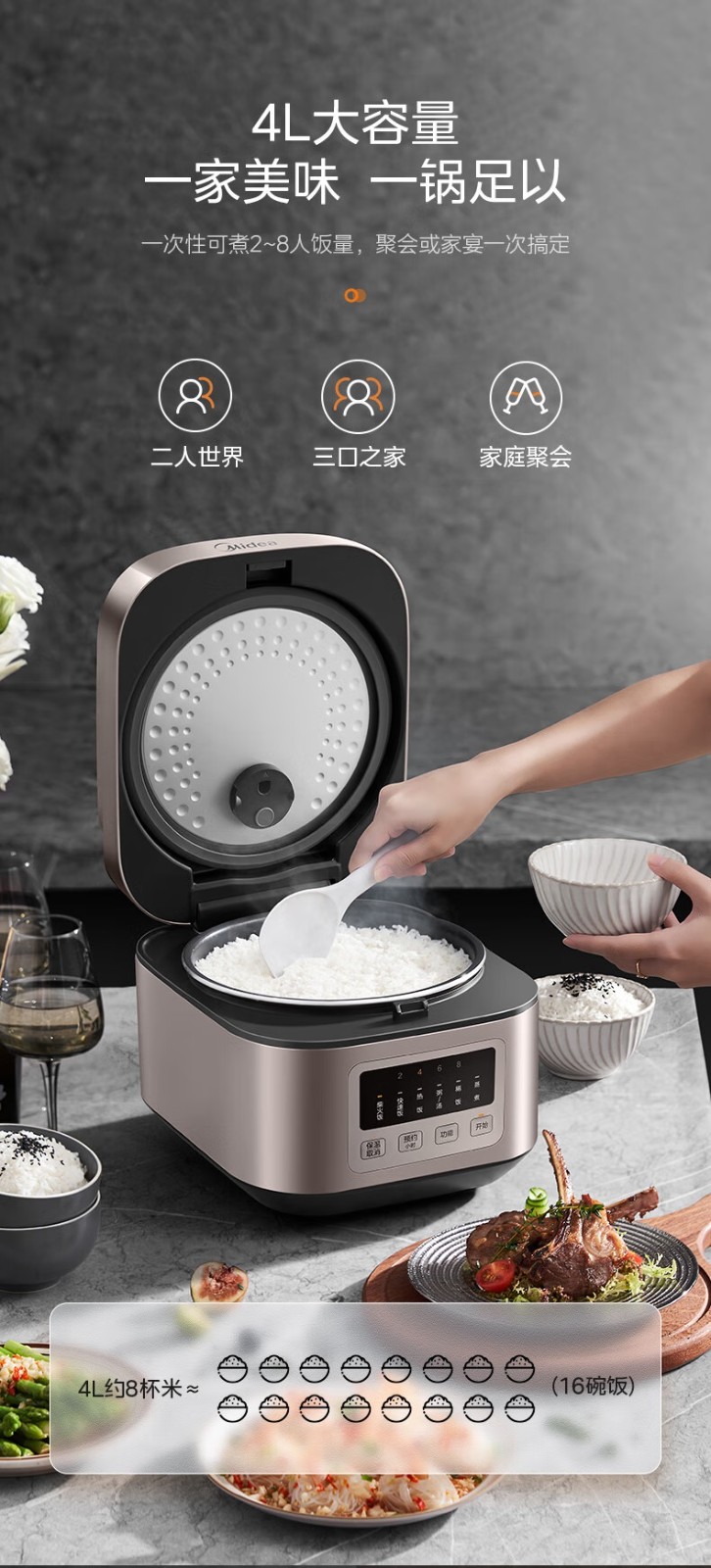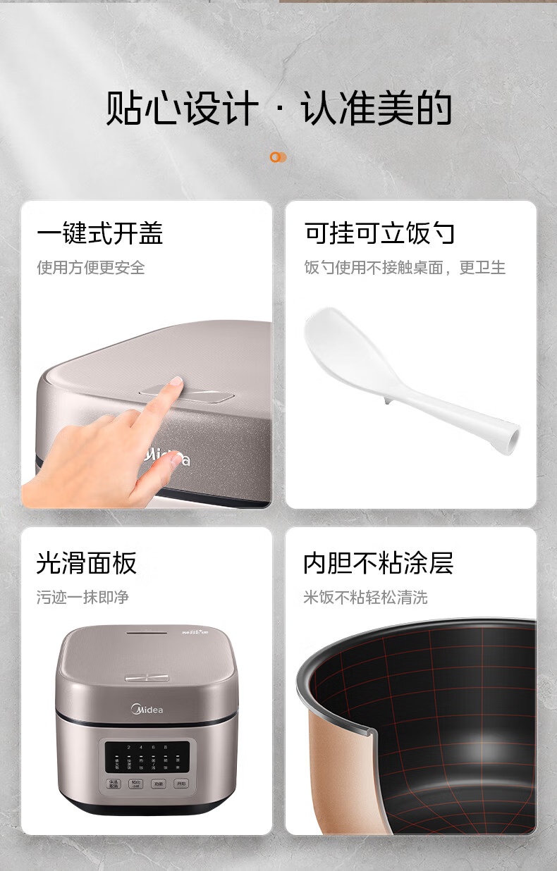 商品名称:(世星阳光)+美的 电饭煲 4L FB4052R 匠铜聚能釜内胆隐藏式微压焖香阀 智能预约 高效储热口口软糯