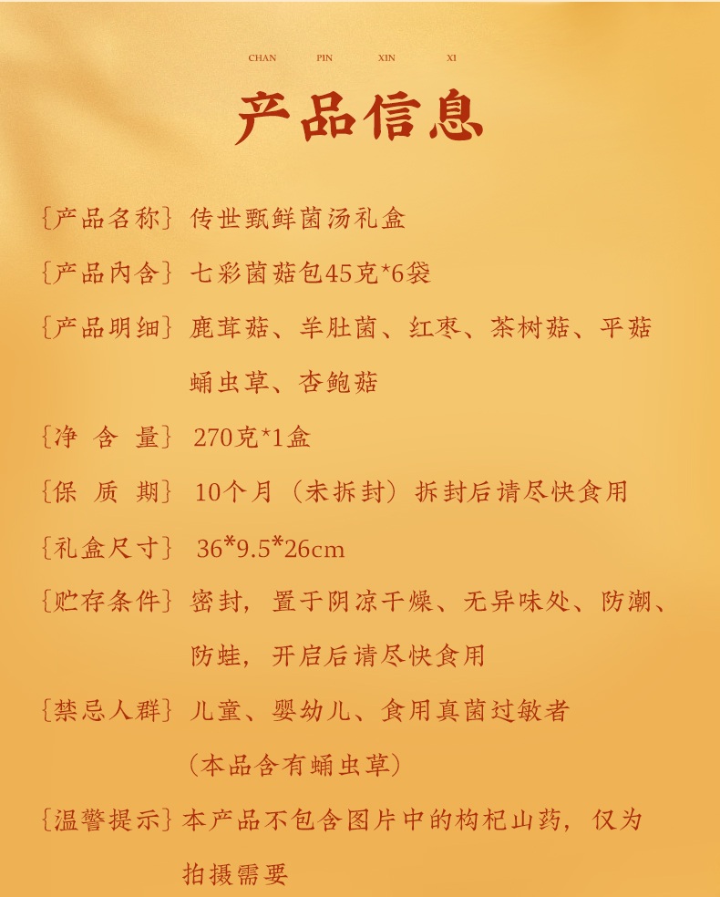 商品名称:(巨邦佑)T+ (yp)宁正丰传世甄鲜菌汤礼盒公司团购福利品270g盒