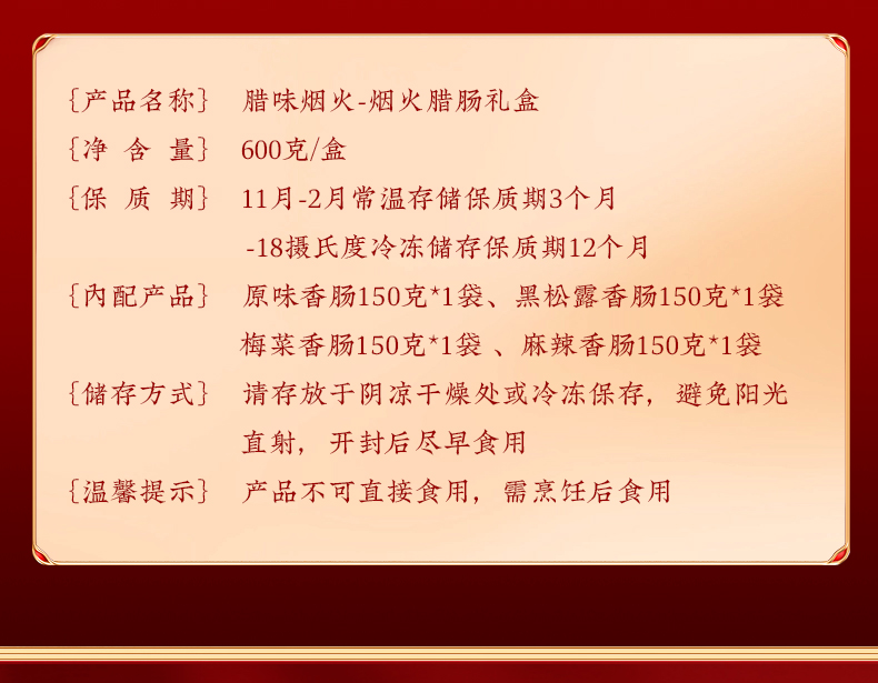商品名称:(巨邦佑)T+ (yp)宁正丰腊味烟火-烟火腊肠礼盒腊味年货大礼包600g盒