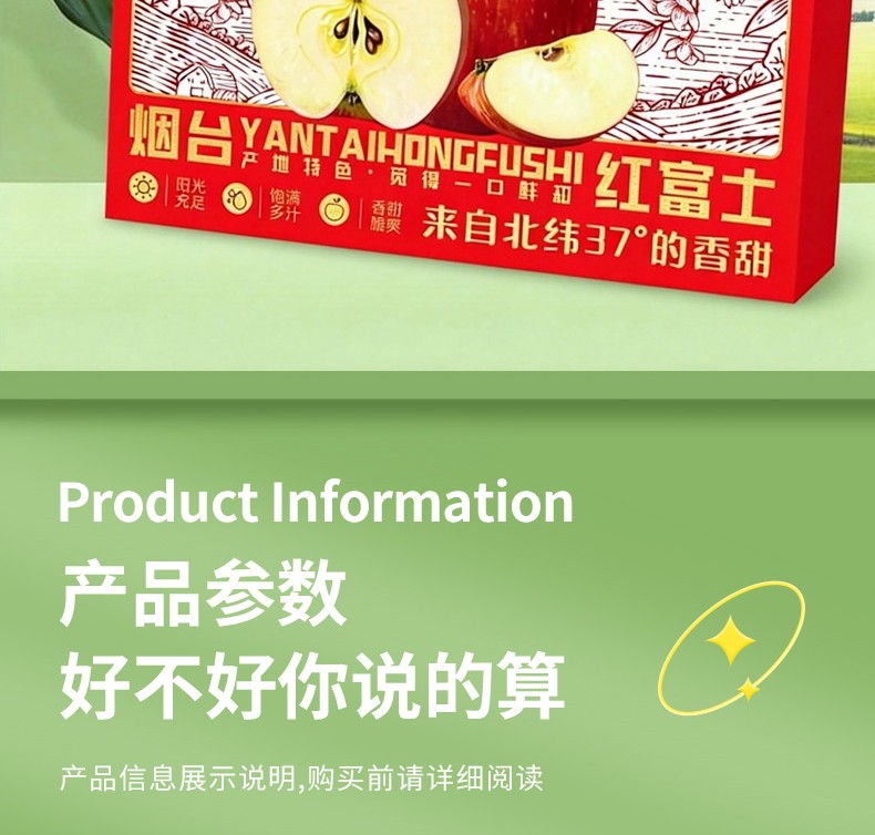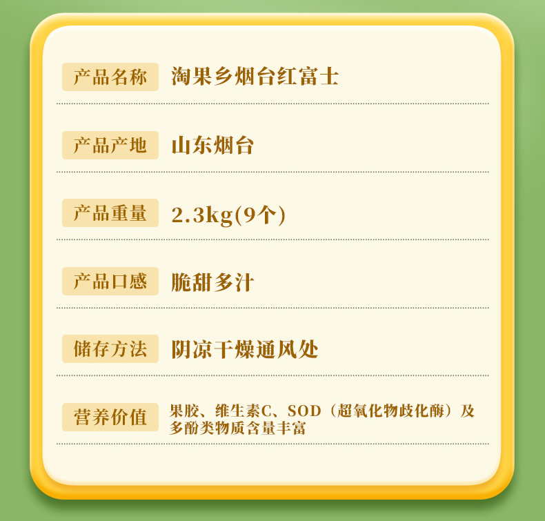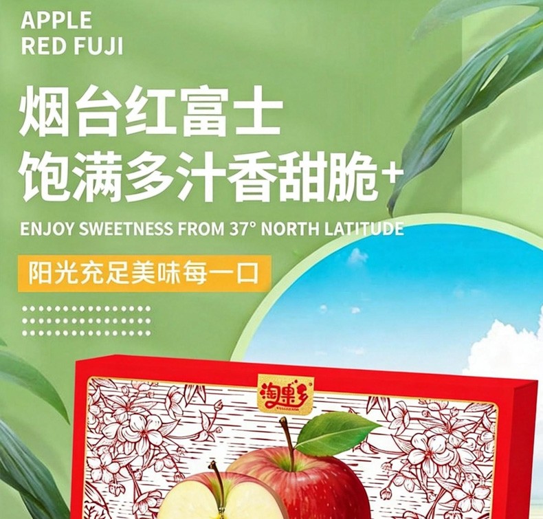 商品名称:(世星阳光)+淘果乡 烟台红富士苹果2.3kg(9个)皮薄肉厚 脆甜多汁 色泽鲜亮 果皮红艳