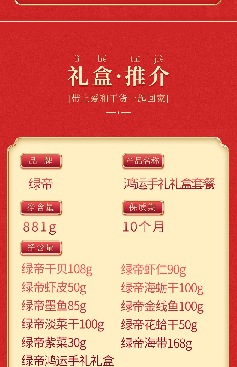 商品名称:(世星阳光)+绿帝鸿运海味海产品干货礼盒881g 南北干货 甄选好食