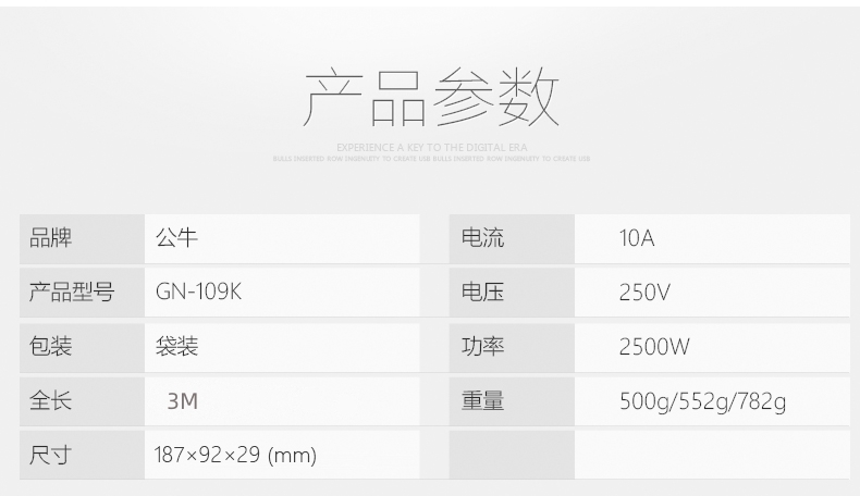 商品名称:(世星阳光)+公牛 新国标插座 6位总控全长3米 109K 优良铜件插套 耐拔插不易松动 轻松按压 通断电一键掌控 不用费力拔插头