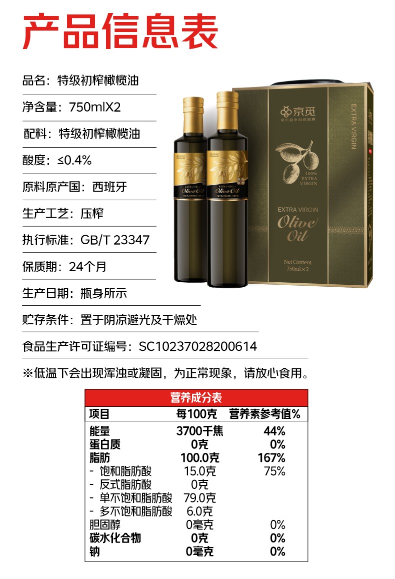 商品名称:(超运·禾贸)京觅特级初榨橄榄油 (特级精品)礼盒装 750ml*2 升级款西班牙原油进口