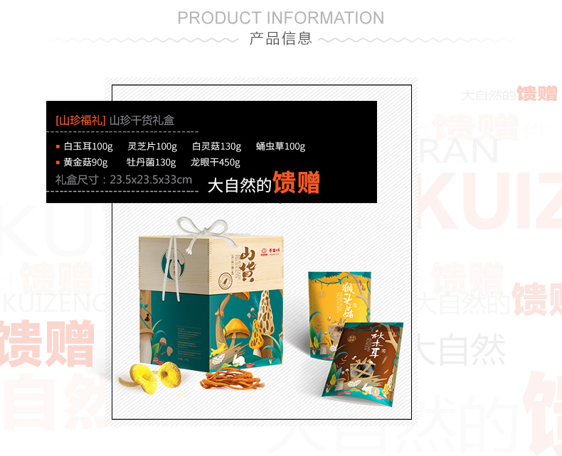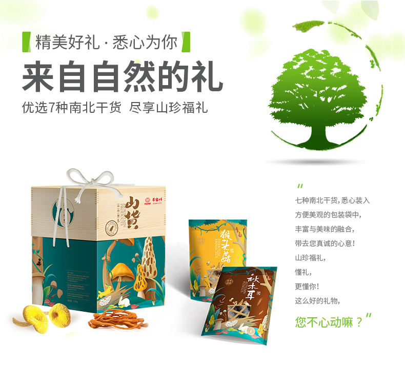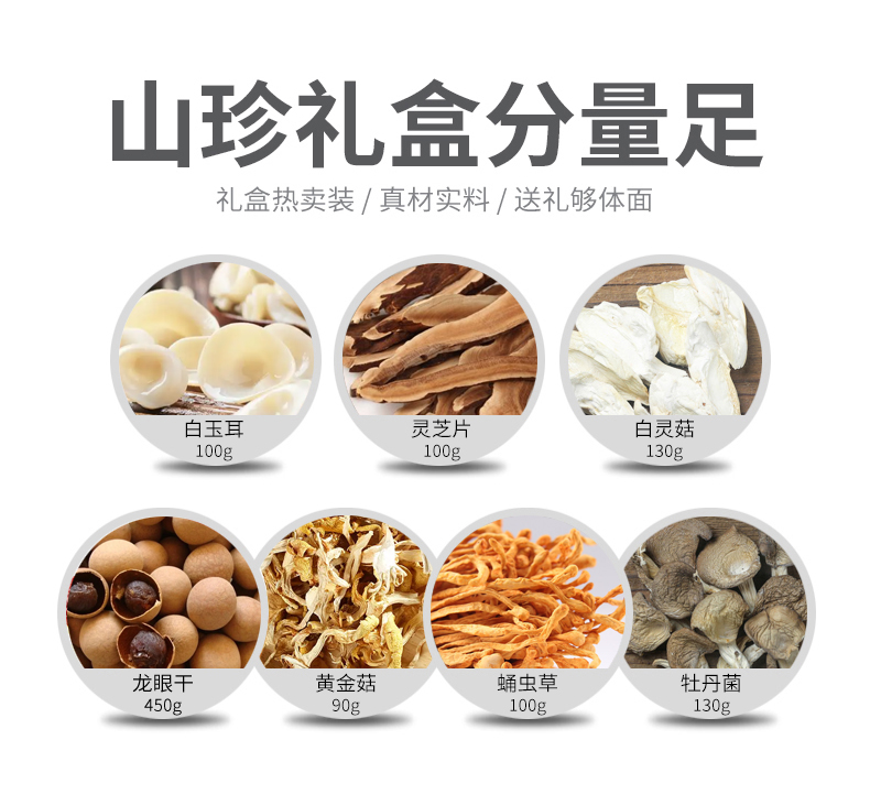 商品名称:(巨邦佑)R+半亩川山珍福礼1100g 蛹虫草灵芝片白玉耳7拼菌菇山珍礼盒