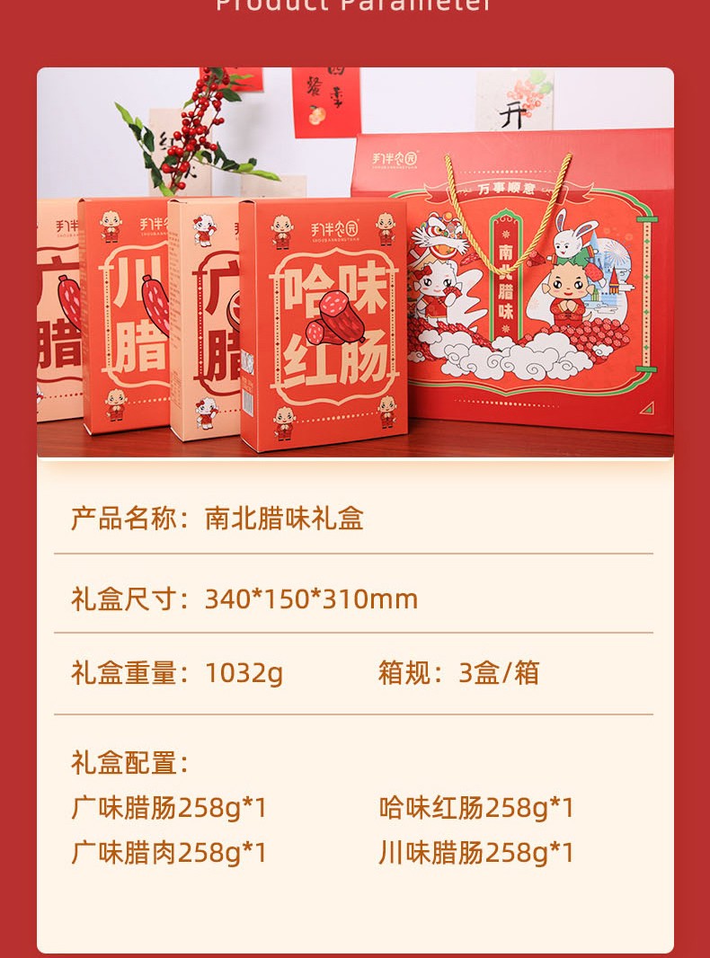 商品名称:(世星阳光)七里浮子 南北腊味礼盒 1032g (广味腊肠258g*1+广味腊肉258g*1+哈味红肠258g*1+川味腊肠258g*1) 产品多样风味独特