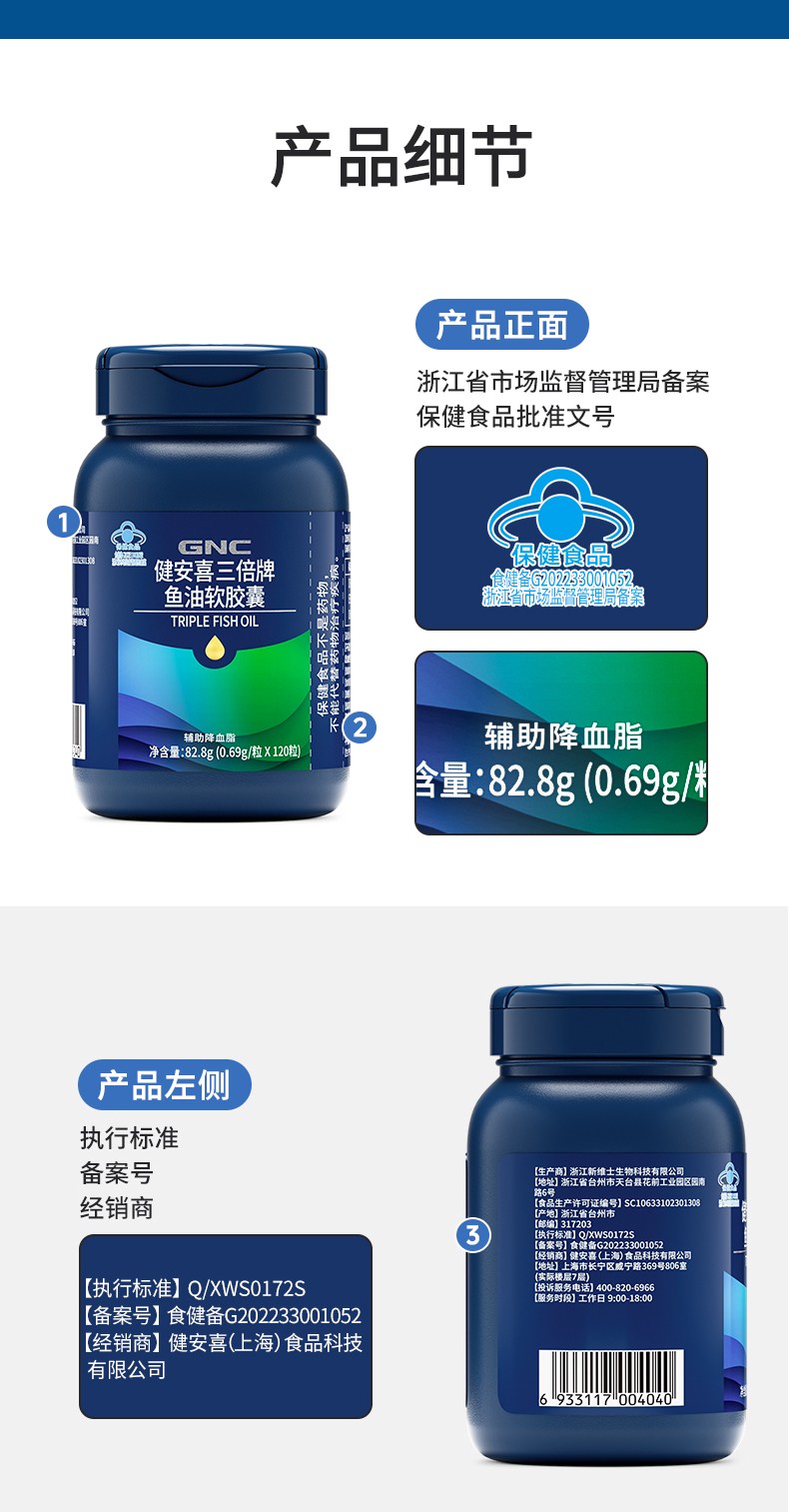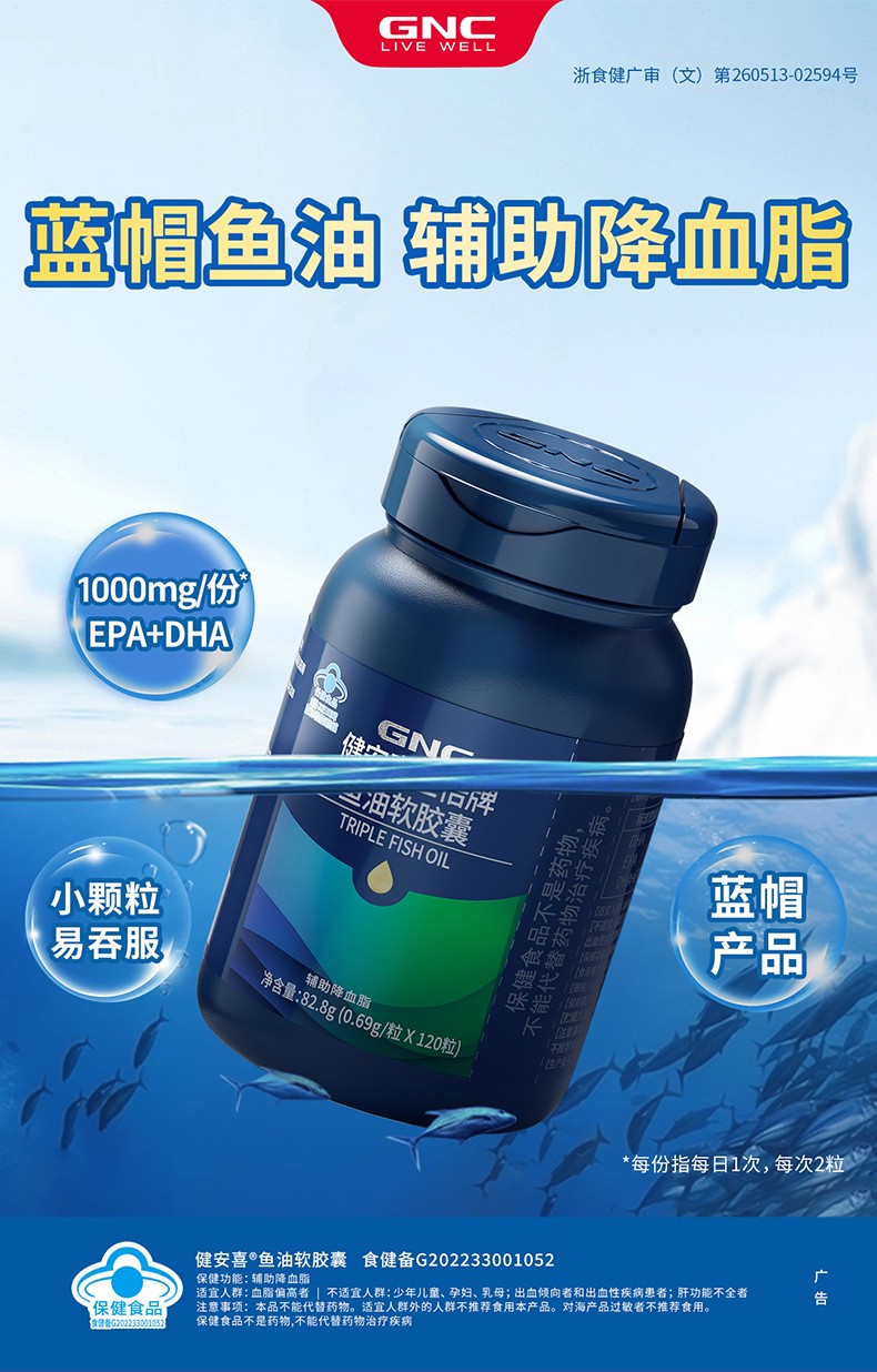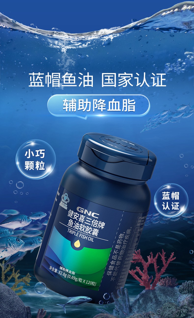 商品名称:(世星阳光)GNC健安喜 三倍牌鱼油软胶囊120粒 蓝帽鱼油 国家认证 辅助降血脂 好鱼油让Omega3含量说话