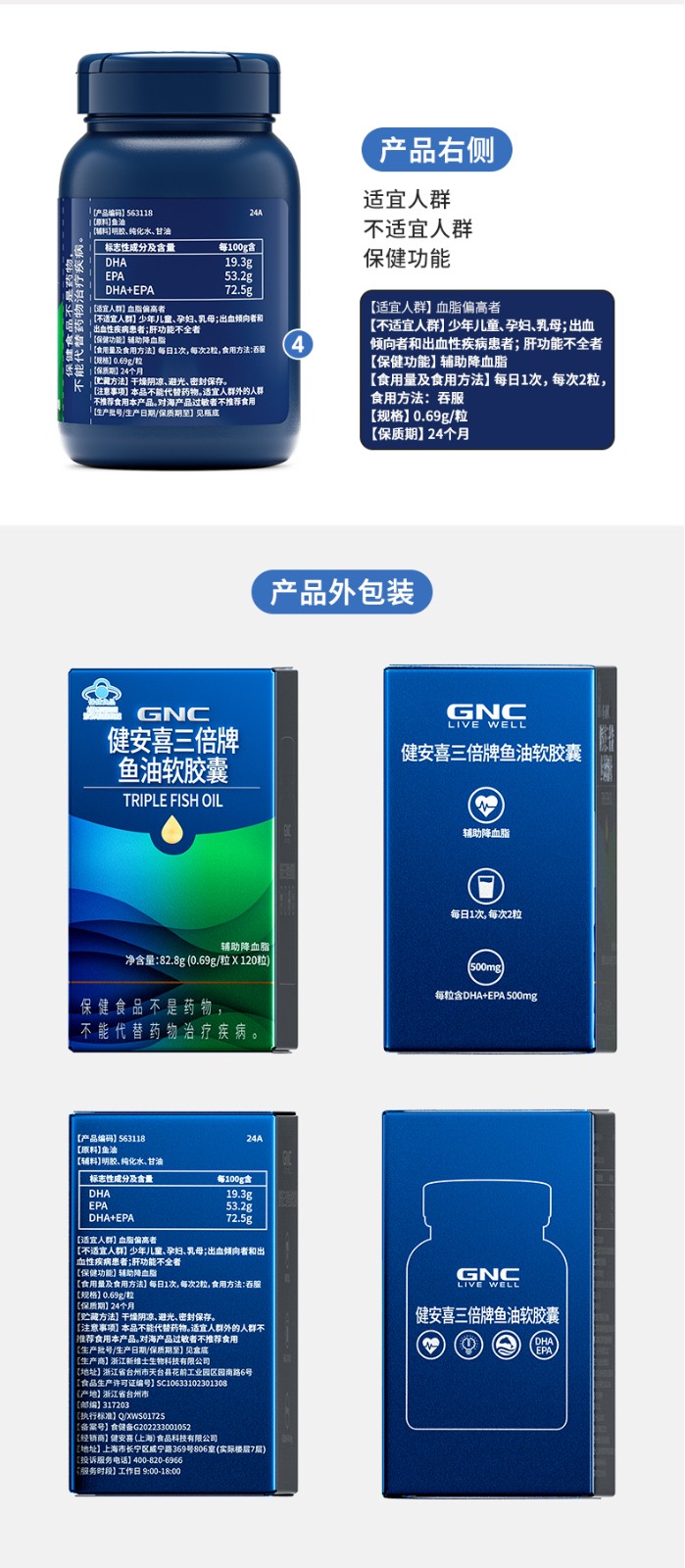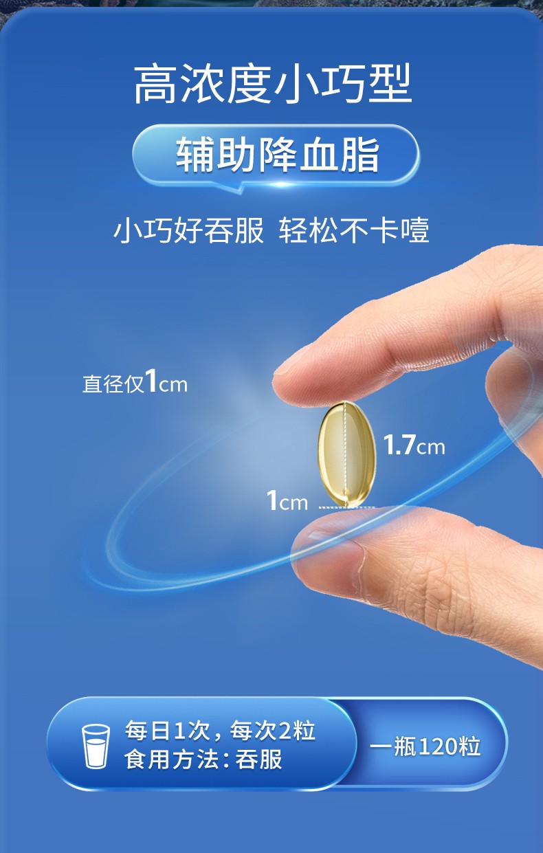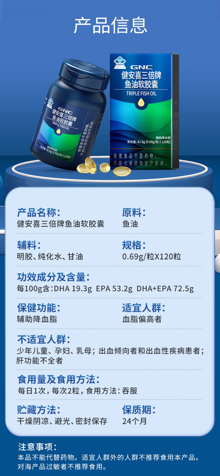 商品名称:(世星阳光)GNC健安喜 三倍牌鱼油软胶囊120粒 蓝帽鱼油 国家认证 辅助降血脂 好鱼油让Omega3含量说话
