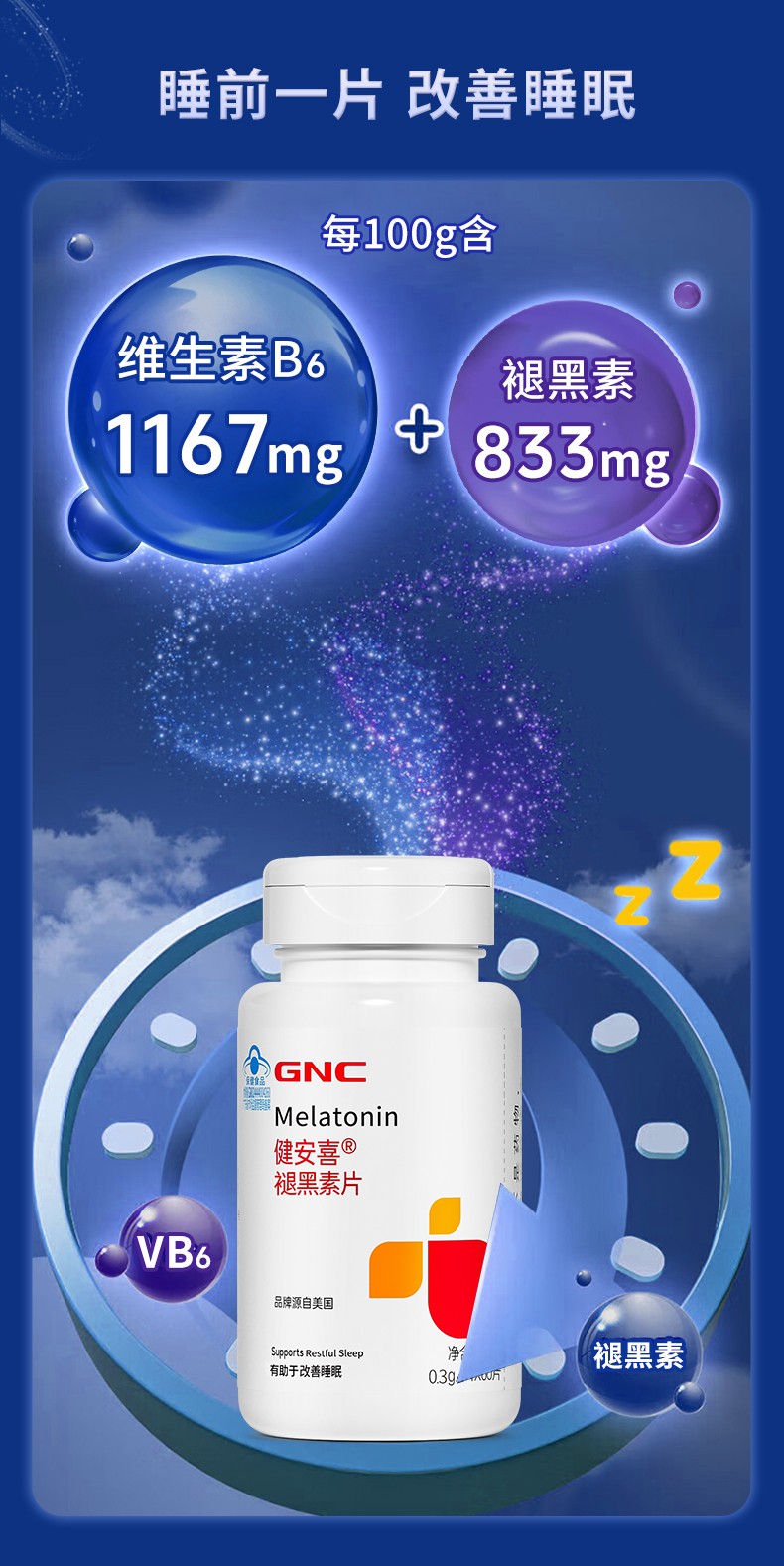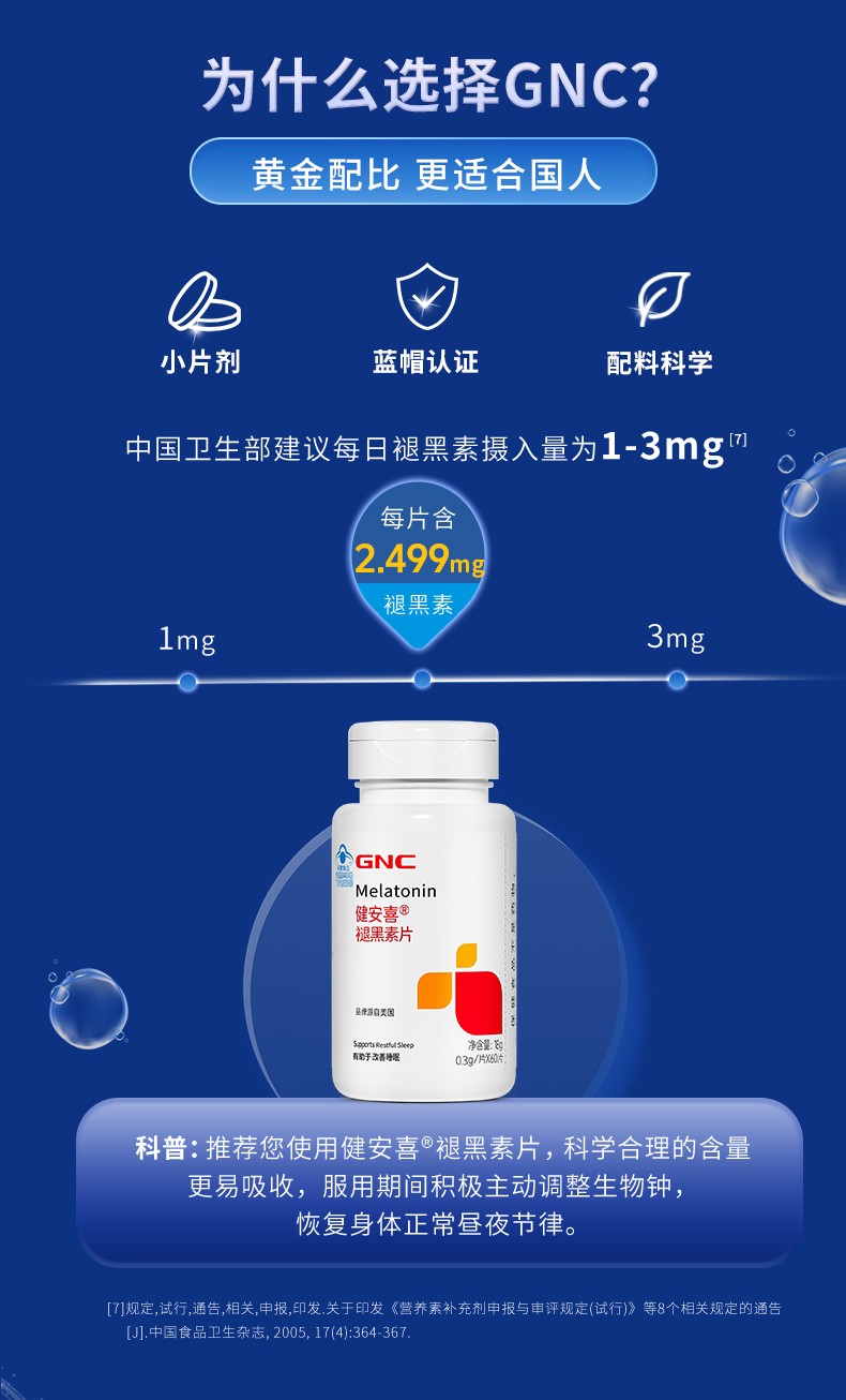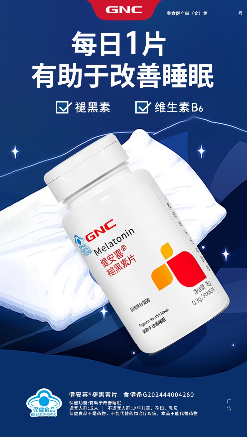 商品名称:(世星阳光)GNC健安喜 褪黑素片60片 每日1片 有助于改善睡眠 褪黑素 维生素B6 协同作用改善睡眠