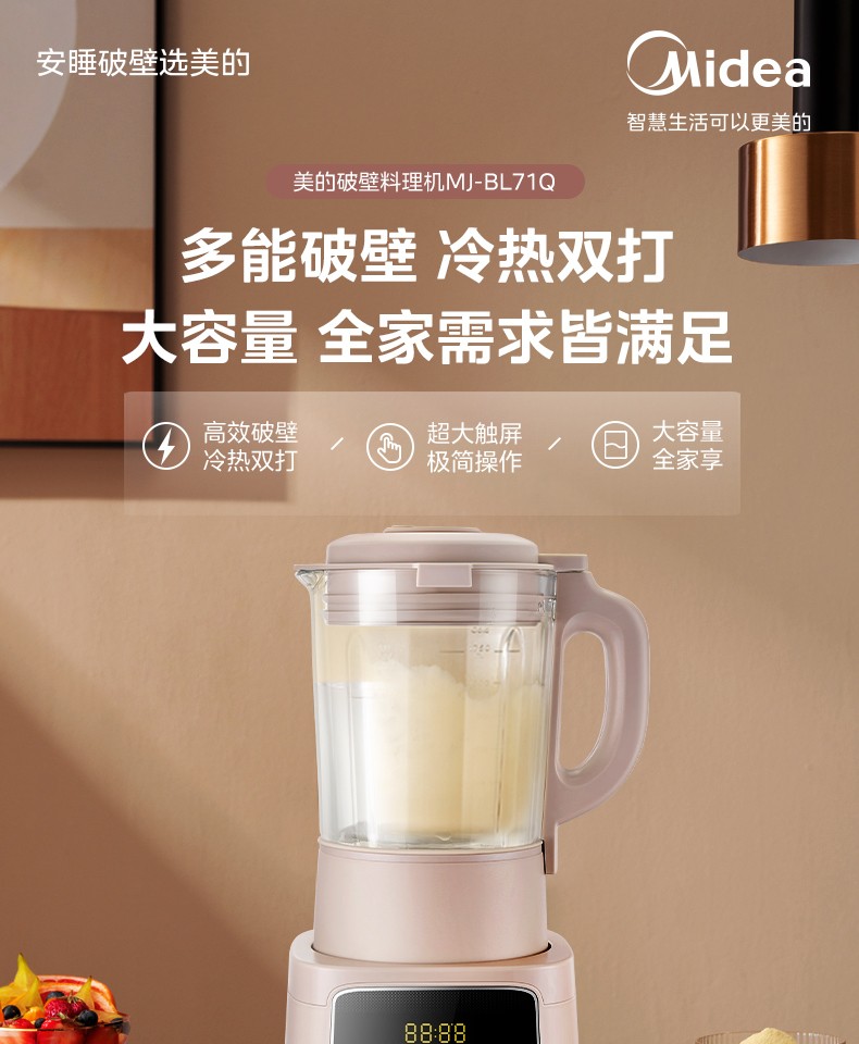(世星阳光)美的 1.75L 破壁机 BL71Q 大触屏 智能菜单 精钢6叶破壁刀片 低音 大功率