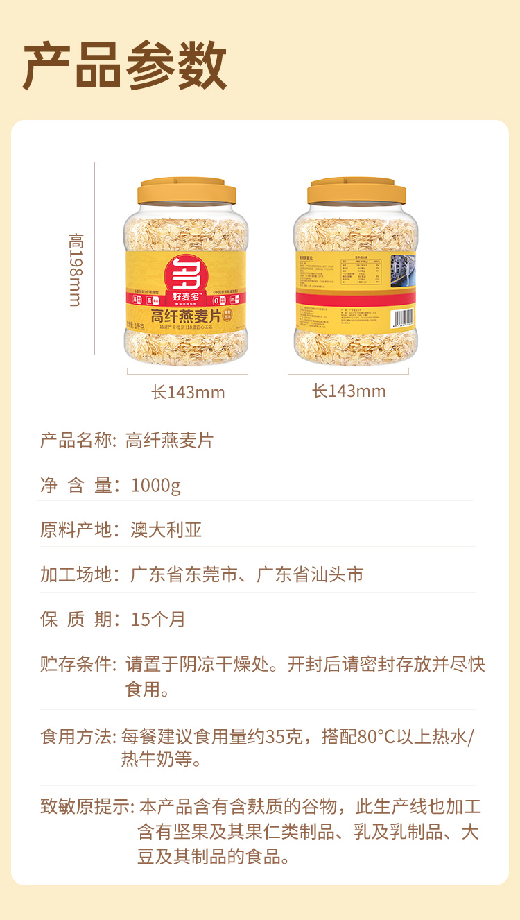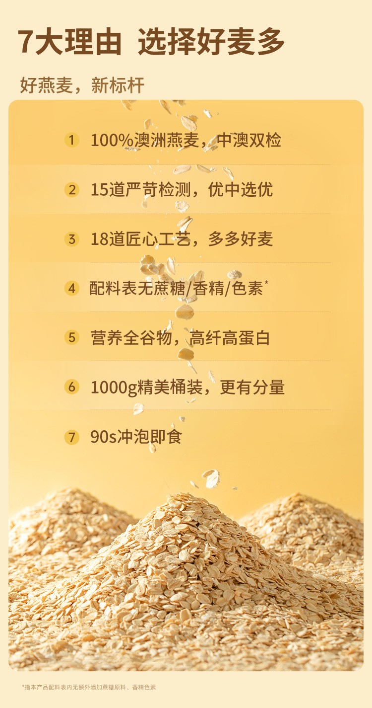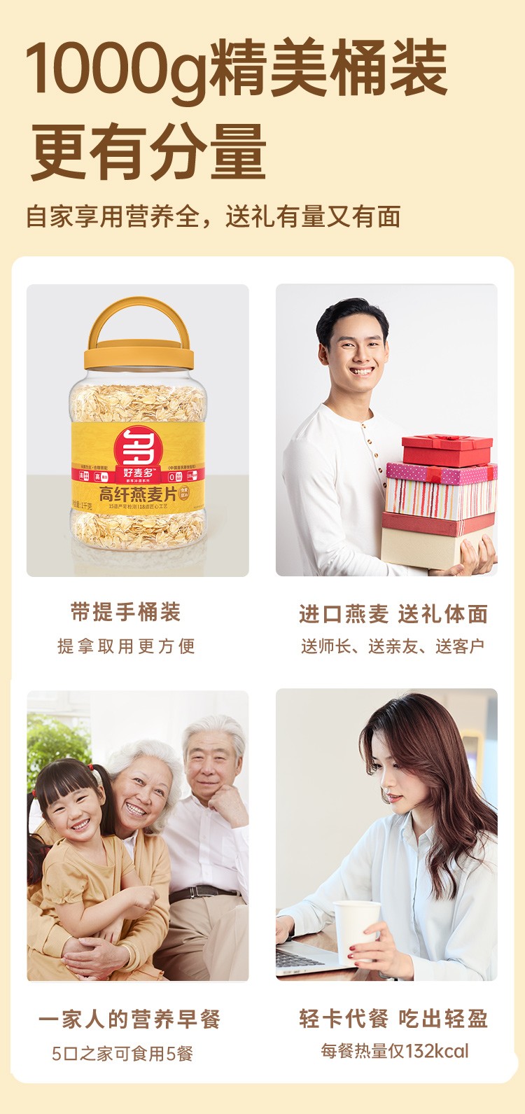 商品名称:(巨邦佑)T+ (yp)好麦多高纤燕麦片1000g 粥糯即食纯燕麦片 高膳食纤维 无0添加蔗糖 冲饮早餐谷物代餐健身 桶装
