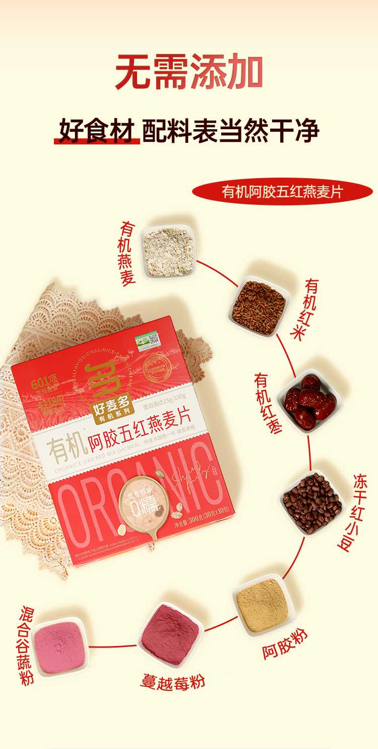 (巨邦佑)T+ (yp)好麦多有机阿胶五红燕麦300g 农科院推荐孕妇即食麦片有机燕麦片儿童营养早餐代餐健身原味黑麦 阿胶养桃花颜