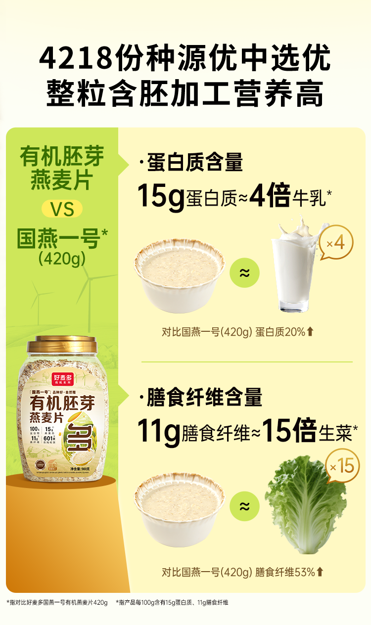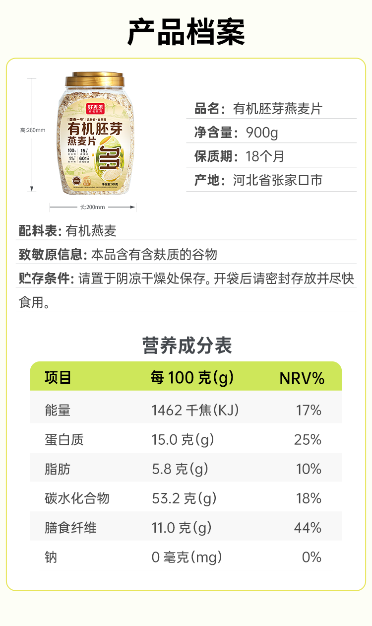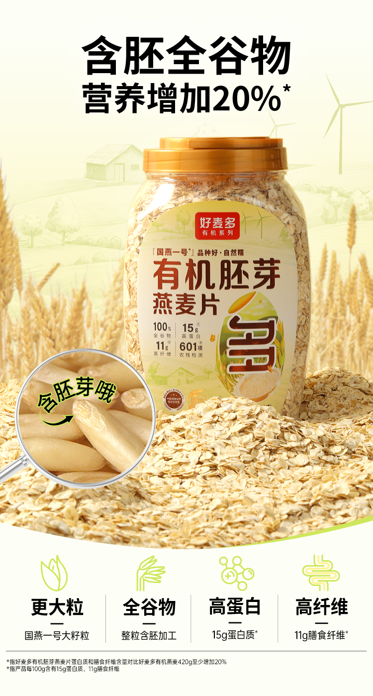 商品名称:(巨邦佑)T+ (yp)好麦多有有机胚芽燕麦片 900g 高蛋白营养冲泡即食代餐轻食早餐0无添加蔗糖 营养多20%