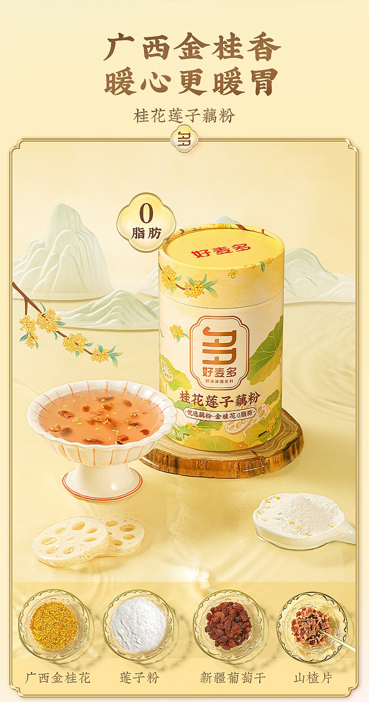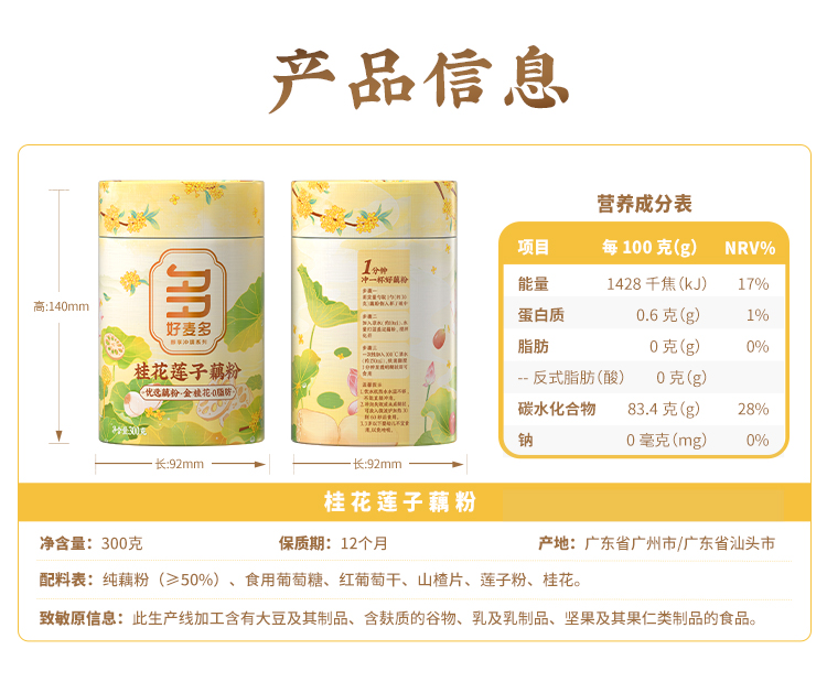 商品名称:(巨邦佑)T+ (yp)好麦多桂花莲子藕粉300g 特产营养代餐懒人冲泡食品年货送礼礼袋装伴手礼 0脂肪