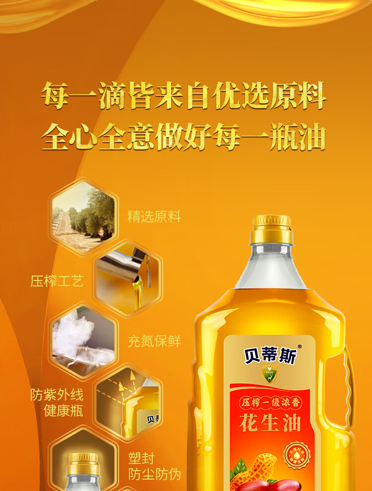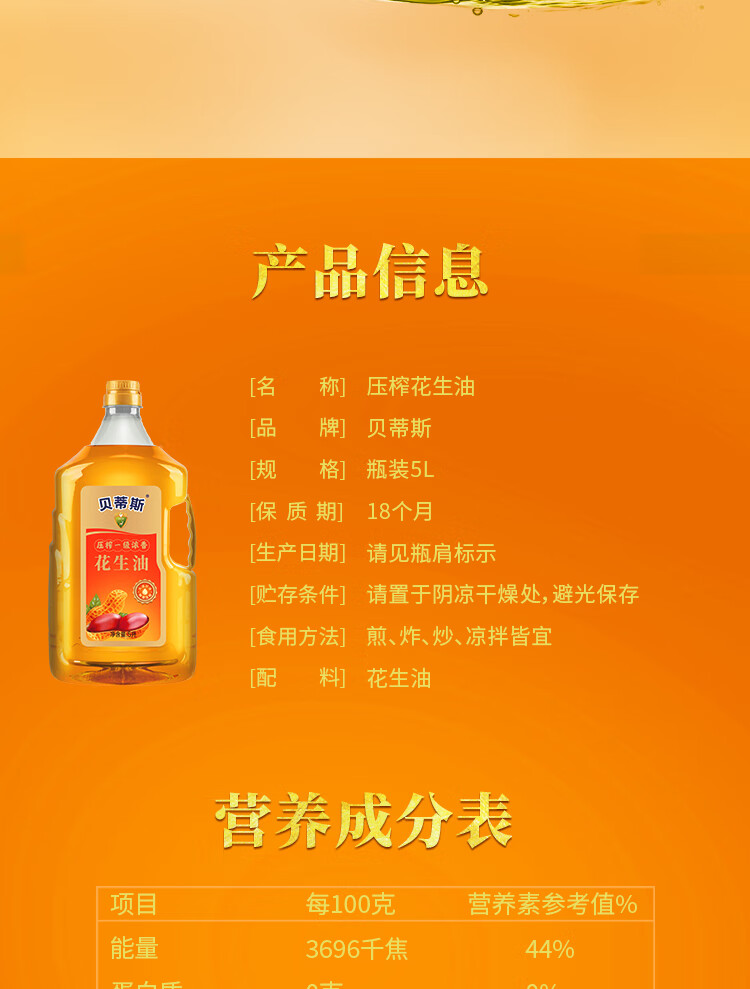 商品名称:(巨邦佑)BJ+贝蒂斯 压榨一级花生油5L 压榨工艺精选原料