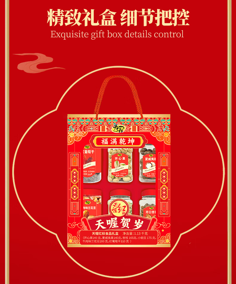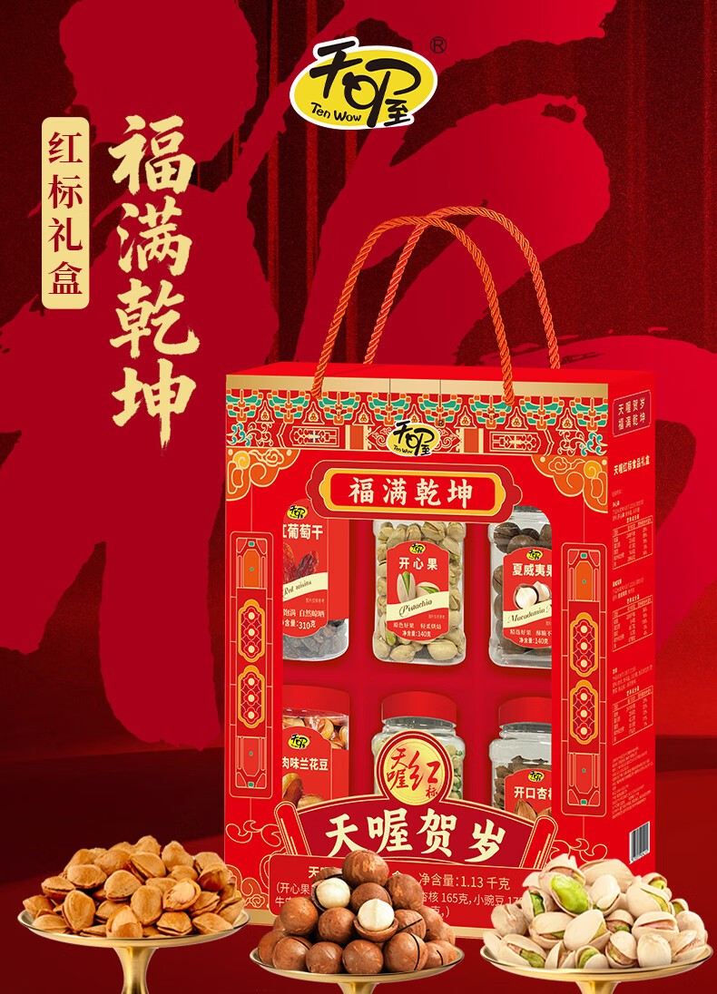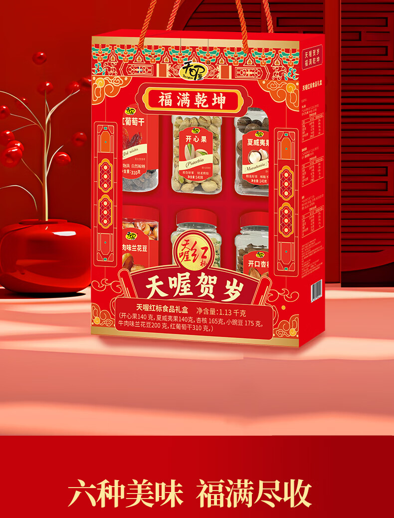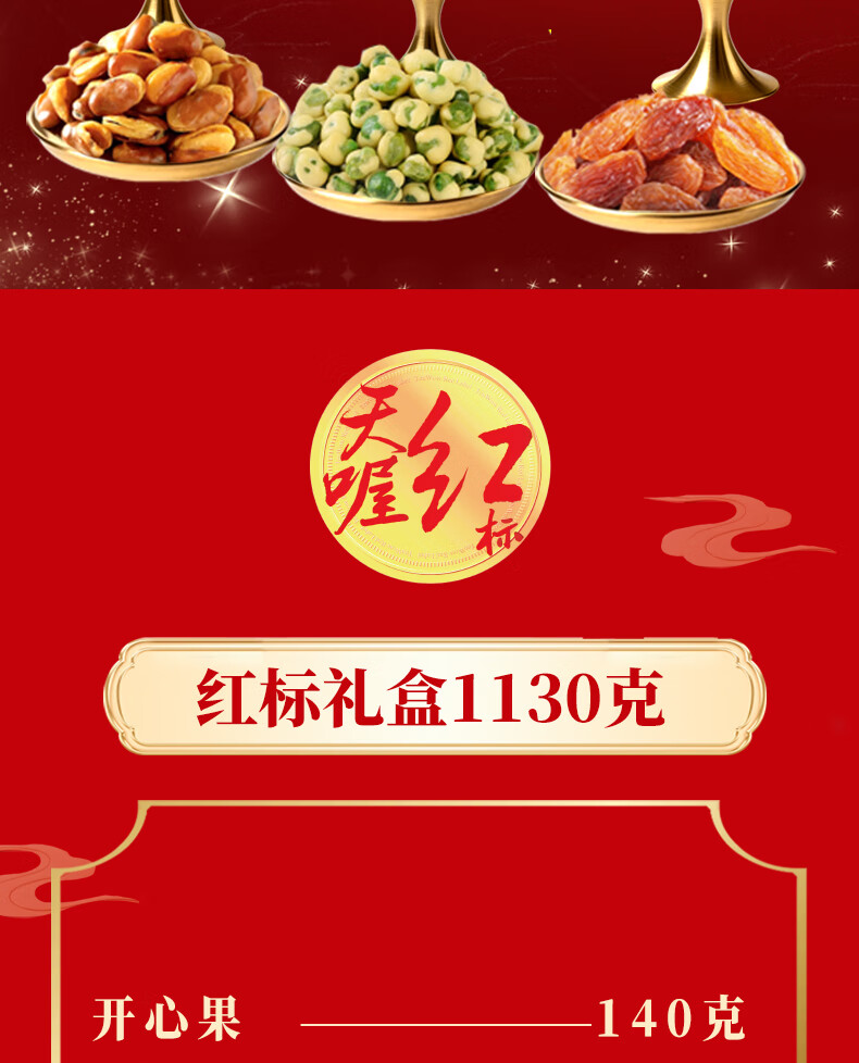 商品名称:(巨邦佑)BJ+天喔 红标礼盒1.13kg 开心果夏威夷果开口杏豌豆兰花豆葡萄干坚果组合