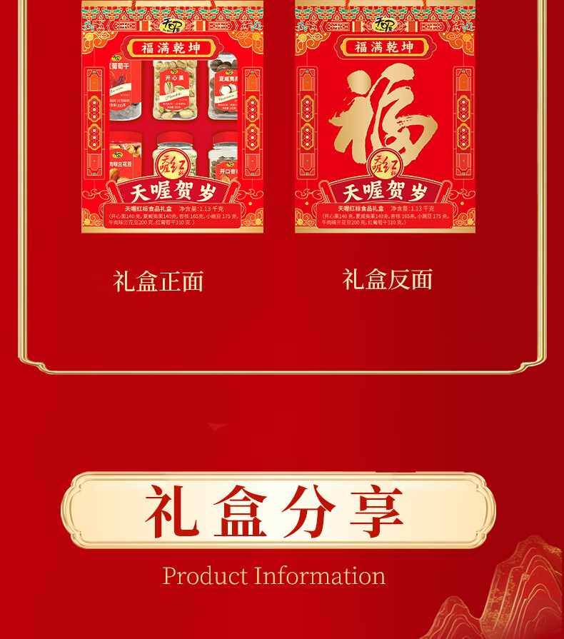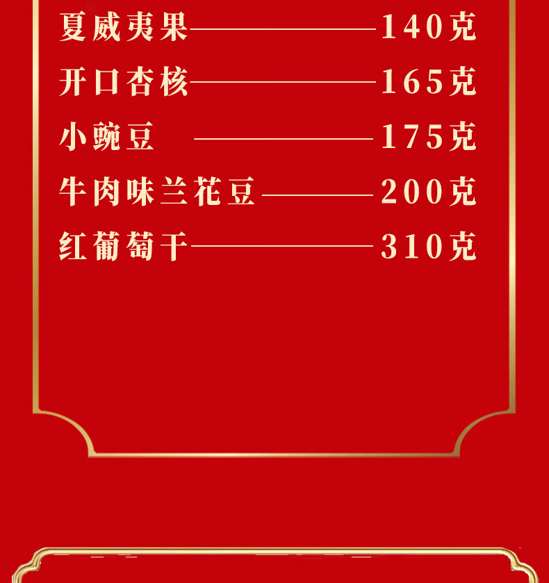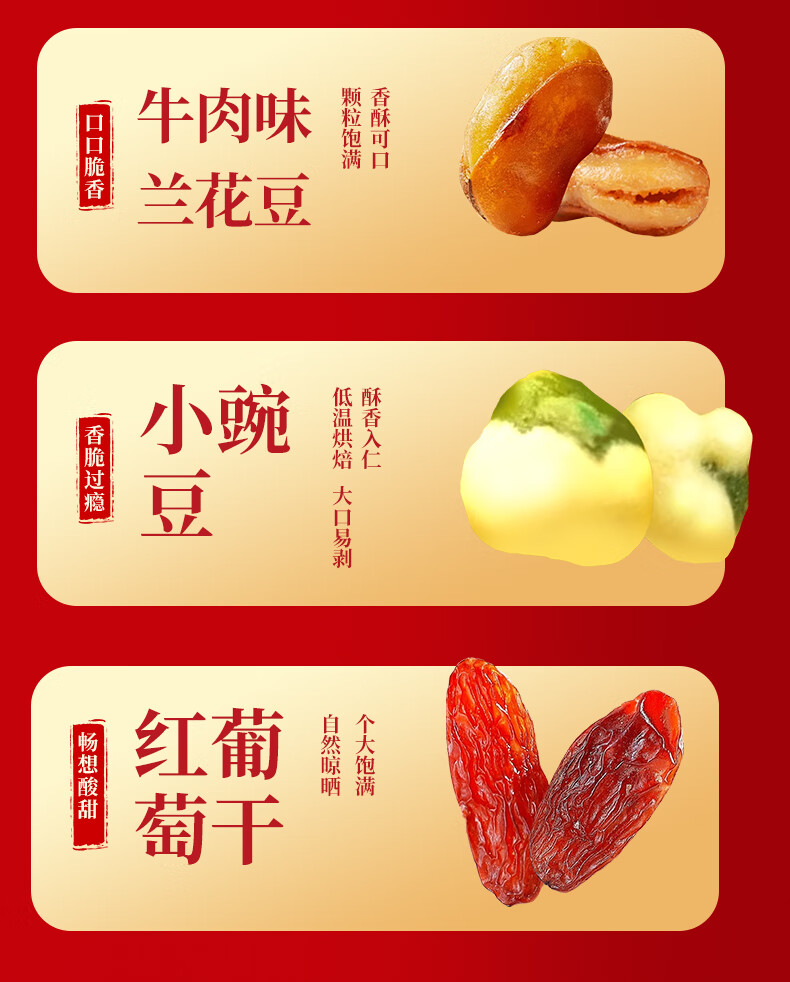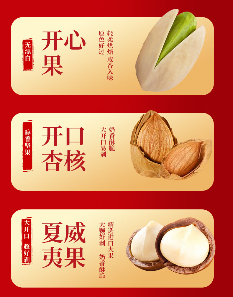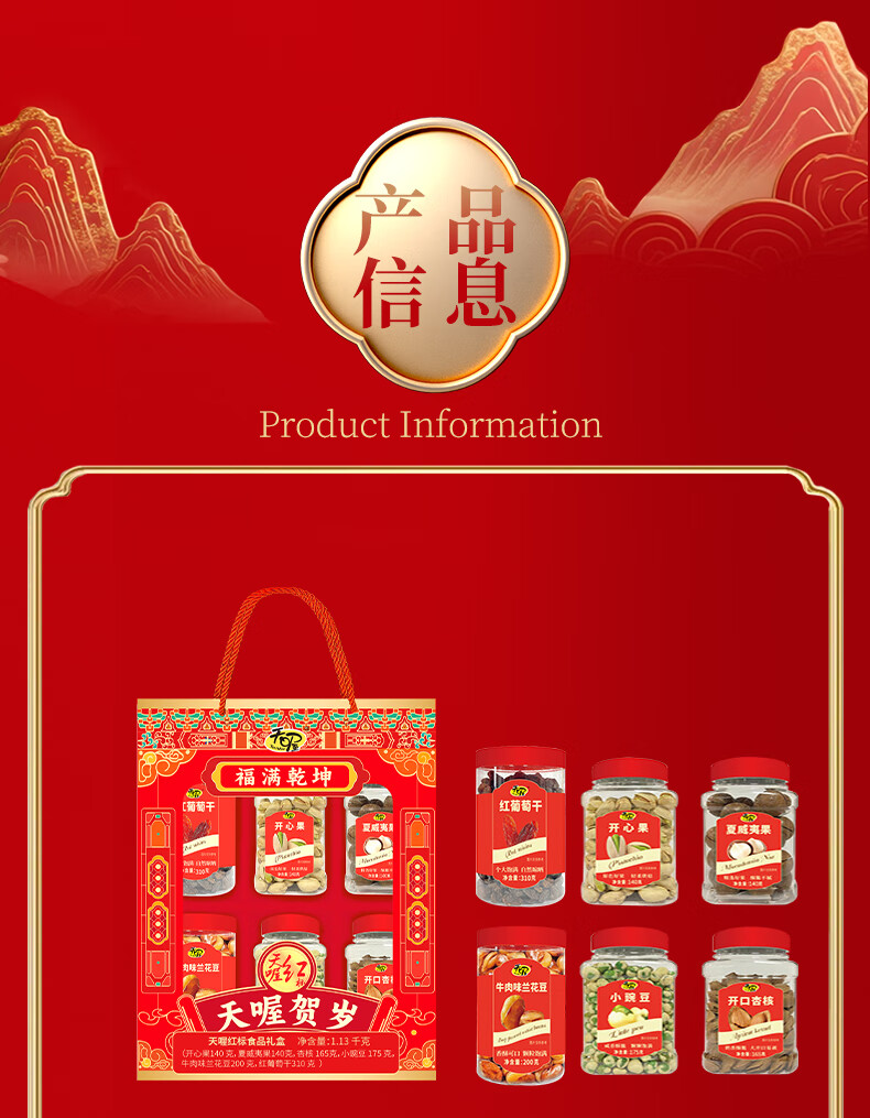 商品名称:(巨邦佑)BJ+天喔 红标礼盒1.13kg 开心果夏威夷果开口杏豌豆兰花豆葡萄干坚果组合