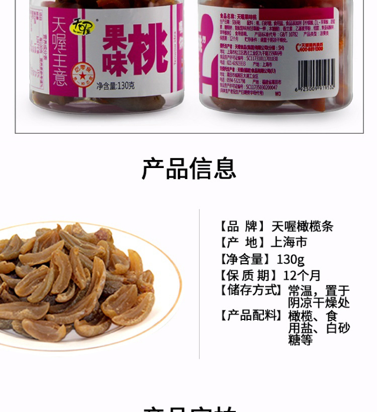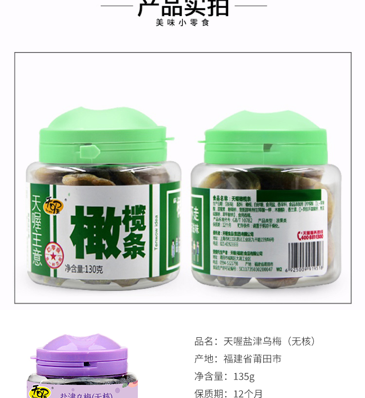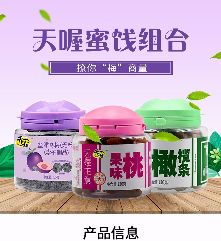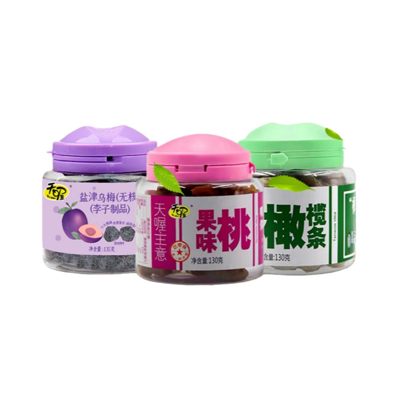 商品名称:(世星阳光)天喔 果味桃130g*1罐 橄榄条130g*1罐 无核盐津乌梅135g*1罐 酸酸甜甜 满口生津 果味清香柔软耐嚼
