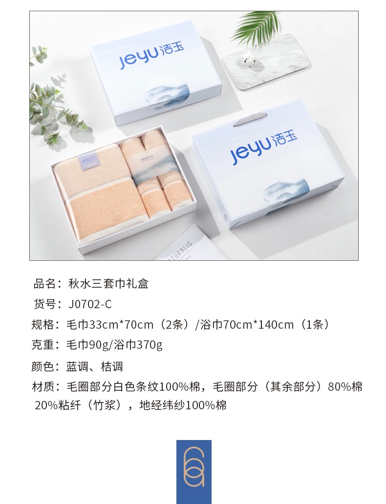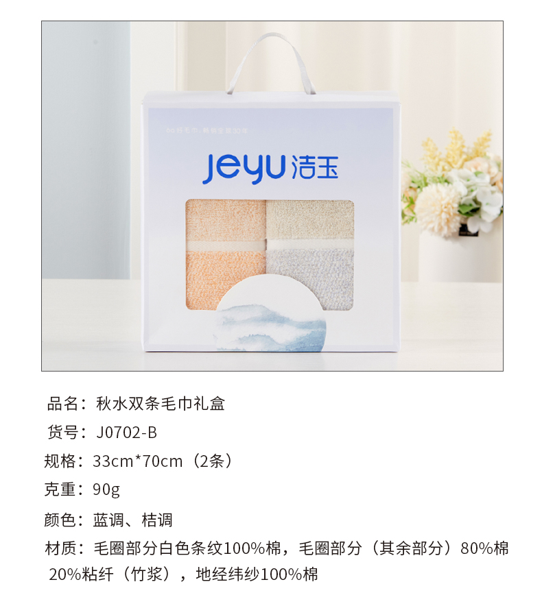 商品名称:(巨邦佑)BJ+洁玉 秋水毛巾双条装礼盒 J0702 颜色随机加厚密实柔软瞬吸收