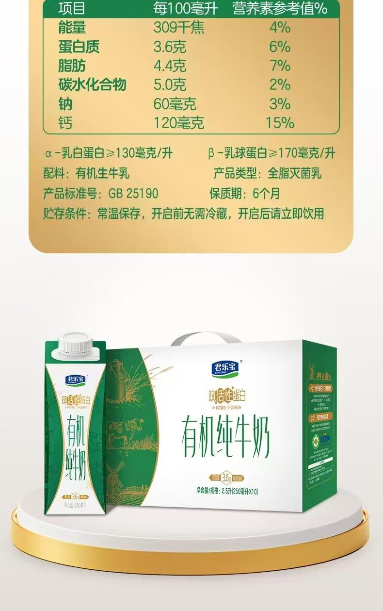商品名称:(巨邦佑)T+ (yp)君乐宝双活性蛋白有机纯牛奶利乐峰250ml*10礼盒 春节企业团购送礼 优质奶源