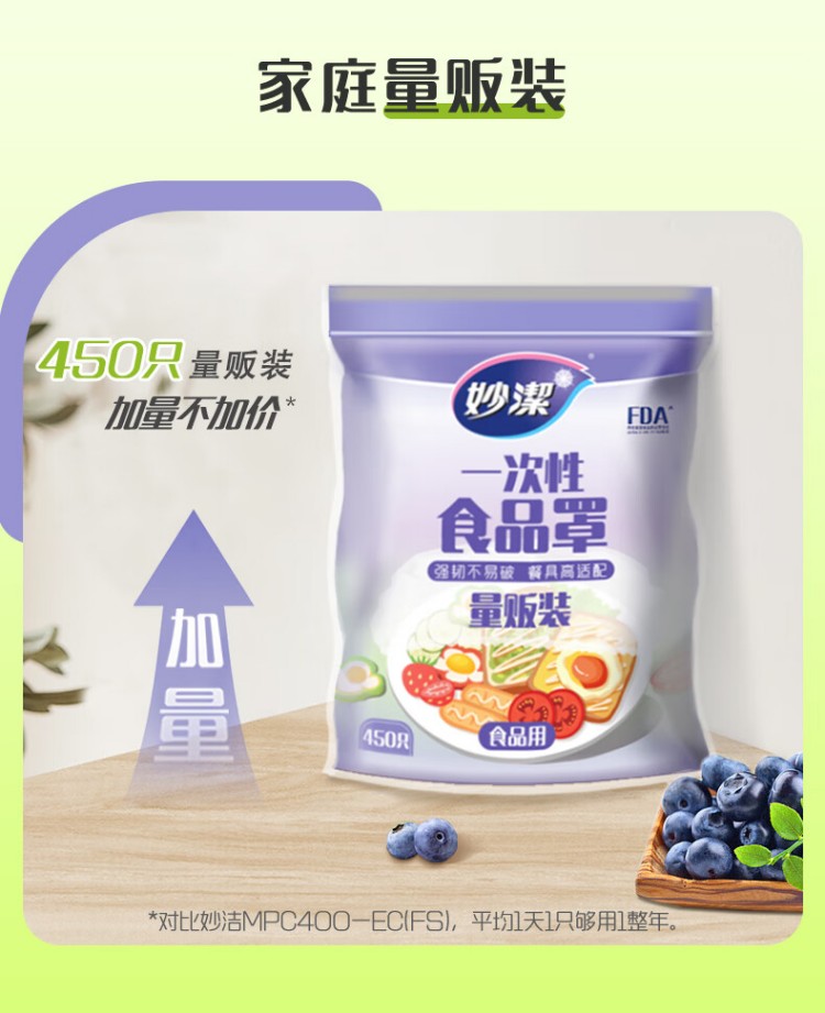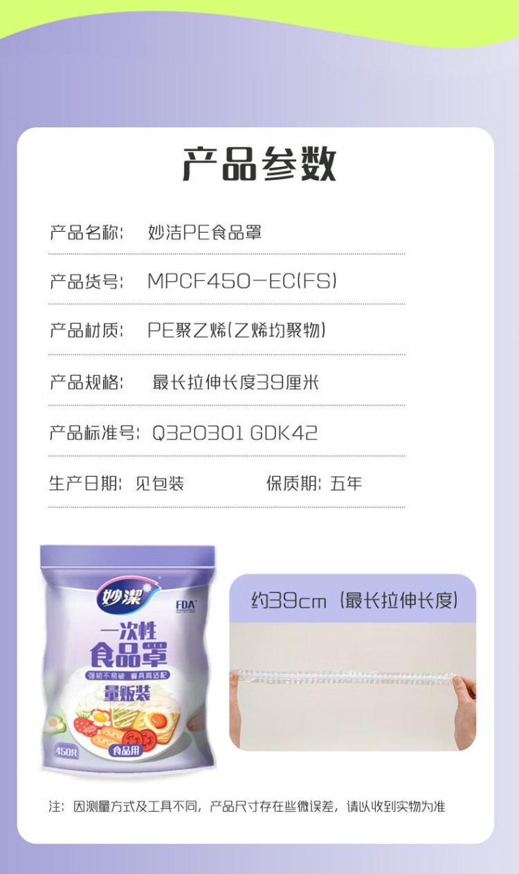 商品名称:(世星阳光)妙洁 一次性食品罩450只 强韧不易破 餐具高适配 安全性食品级原料 微波保口感冷藏防窜味