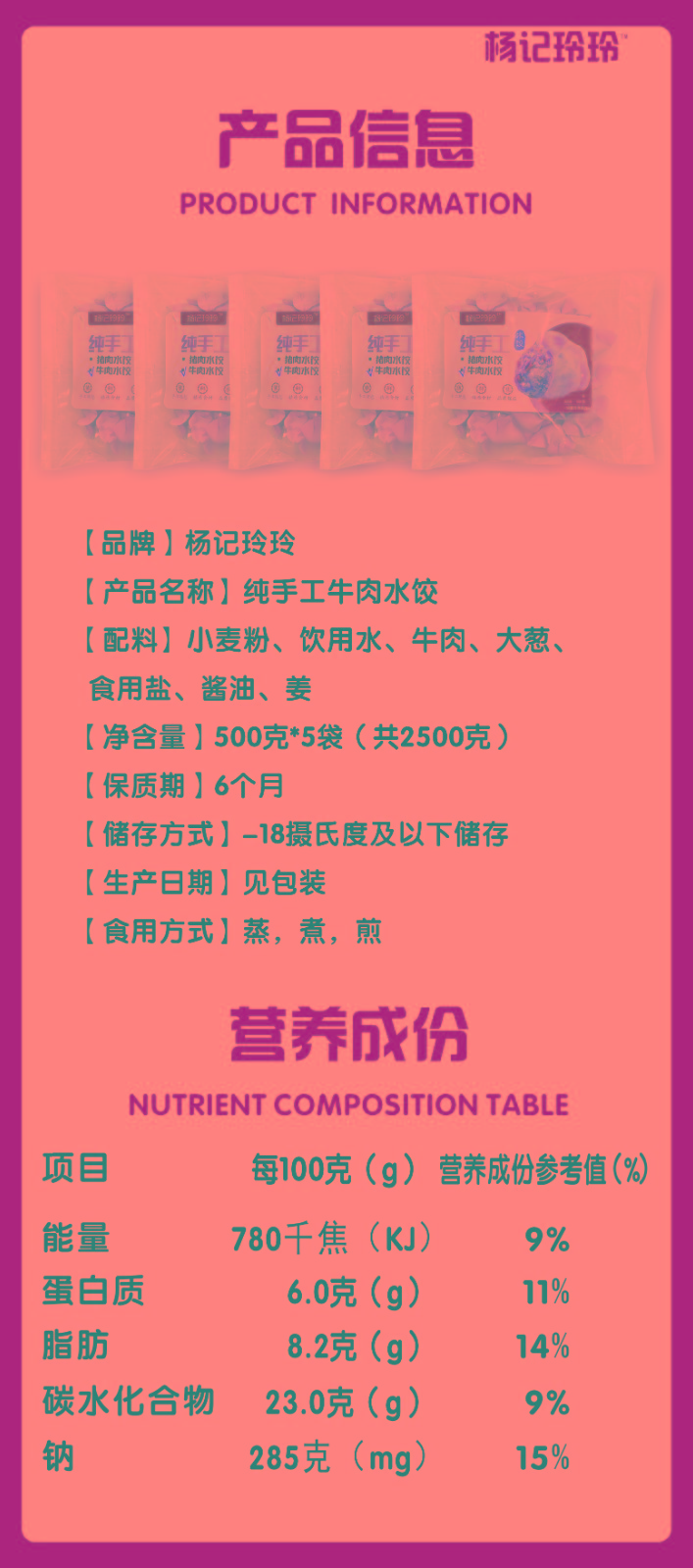 商品名称:(世星阳光) 杨记玲玲 手工水饺 牛肉水饺 5袋2500g 简装 纯手工水饺 食材新鲜 无添加