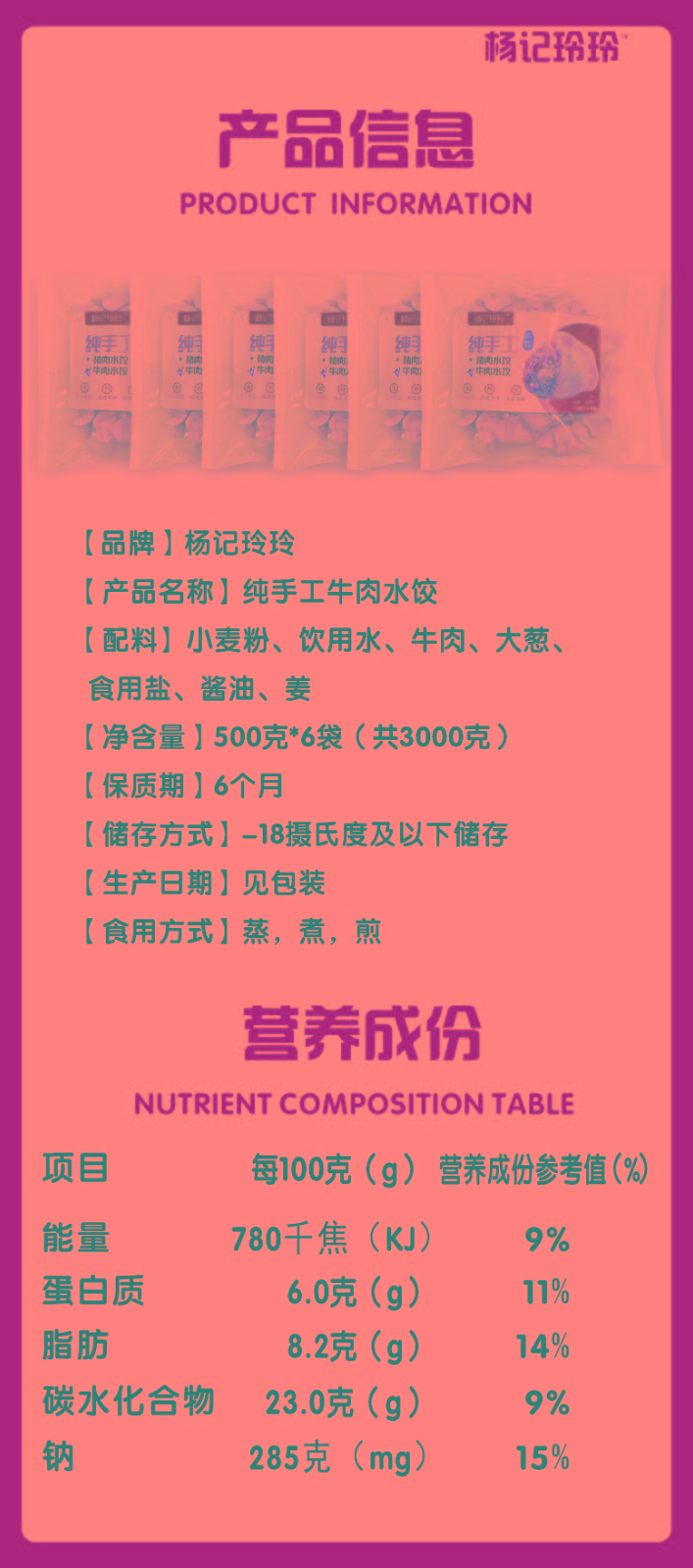 商品名称:(世星阳光) 杨记玲玲 手工水饺 牛肉水饺 6袋3000g 简装 纯手工水饺 食材新鲜 无添加