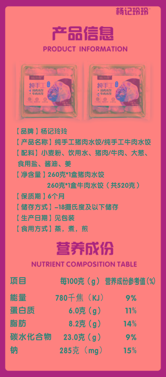 商品名称:(世星阳光) 杨记玲玲 手工水饺 猪肉牛肉混装(尝鲜款)1+1共2盒520g 盒装 纯手工水饺 食材新鲜 无添加
