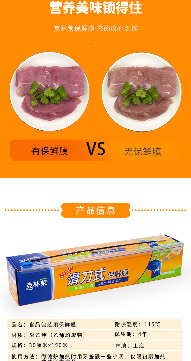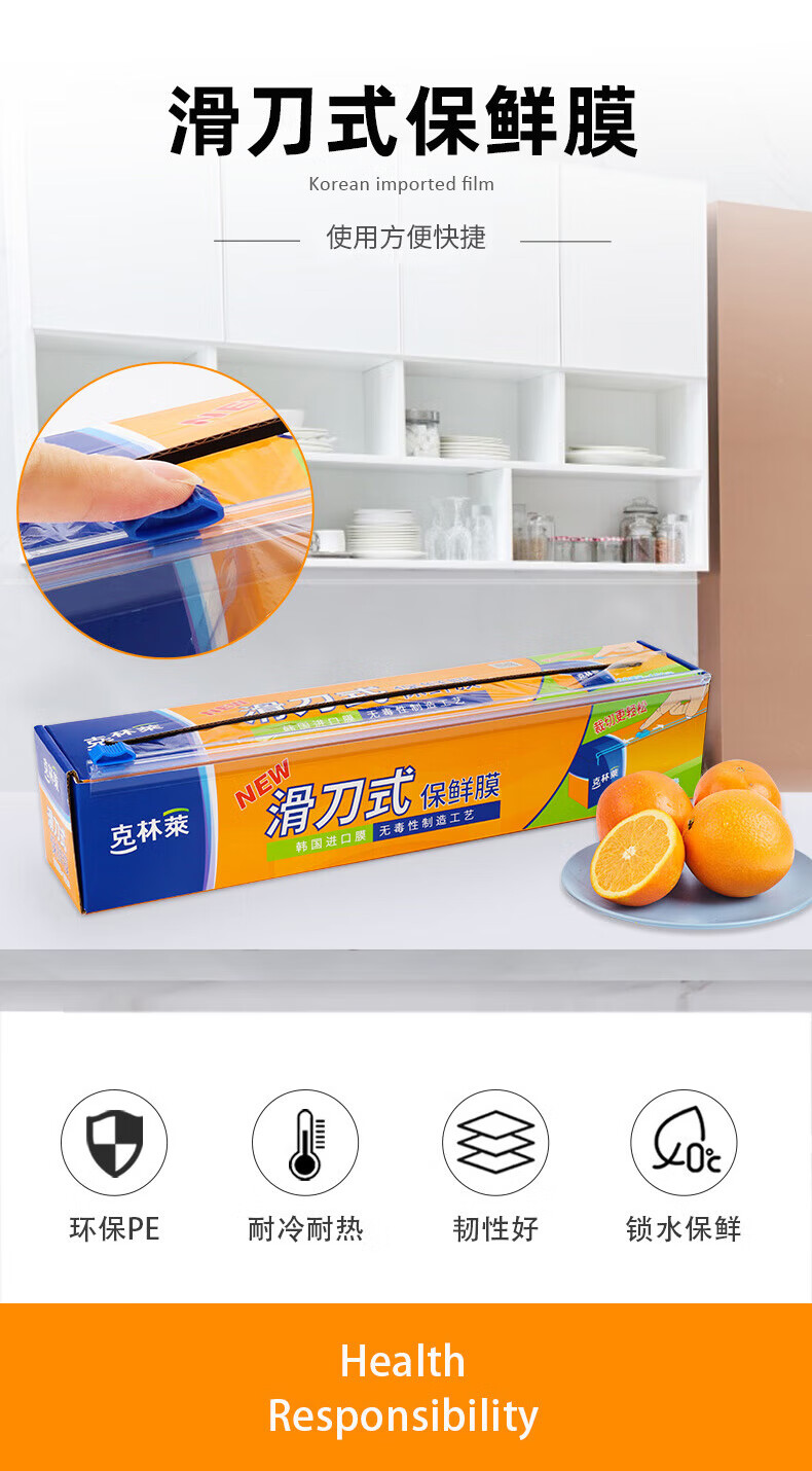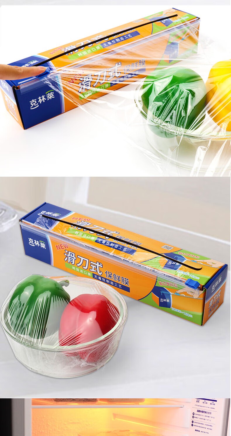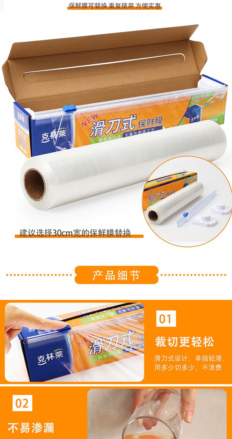 商品名称:(巨邦佑)BJ+克林莱 一次性滑刀式PE进口保鲜膜30cm*150m WHH-1047 盒装大卷带切割器耐高温切割