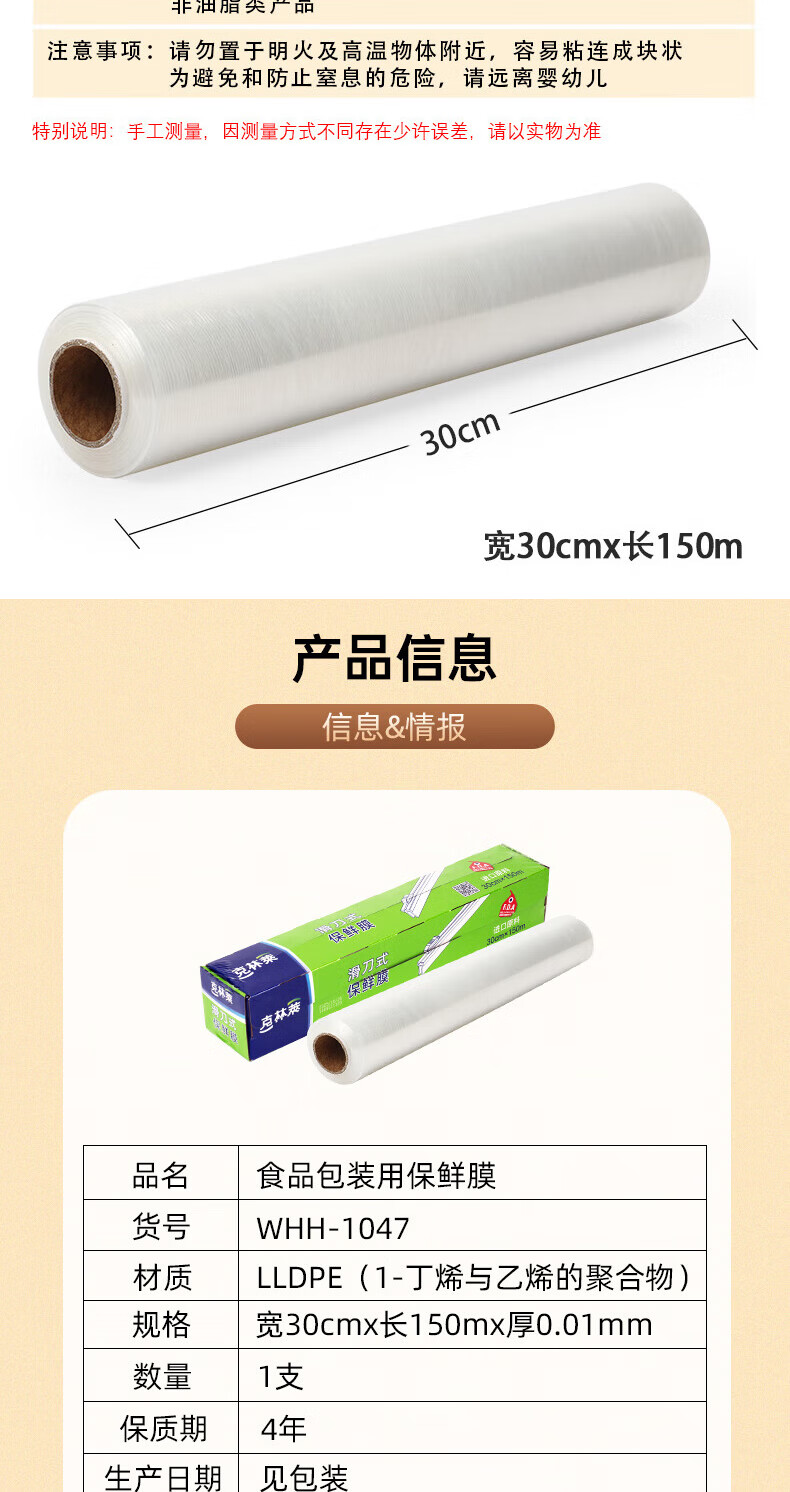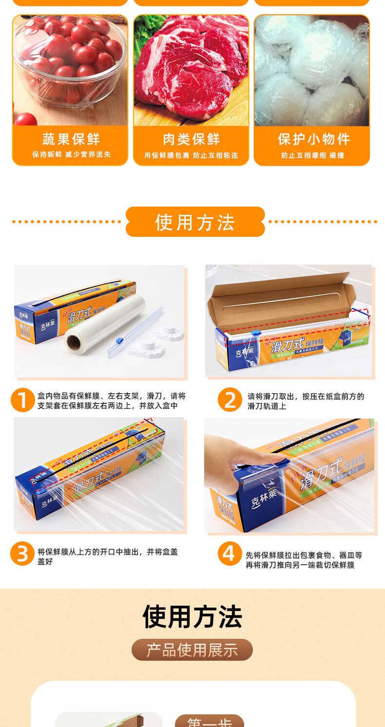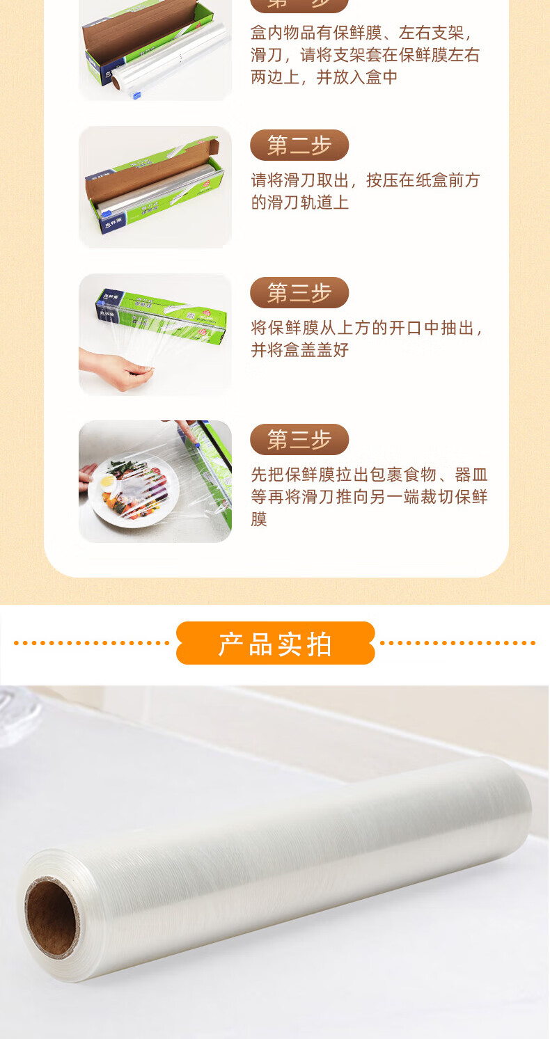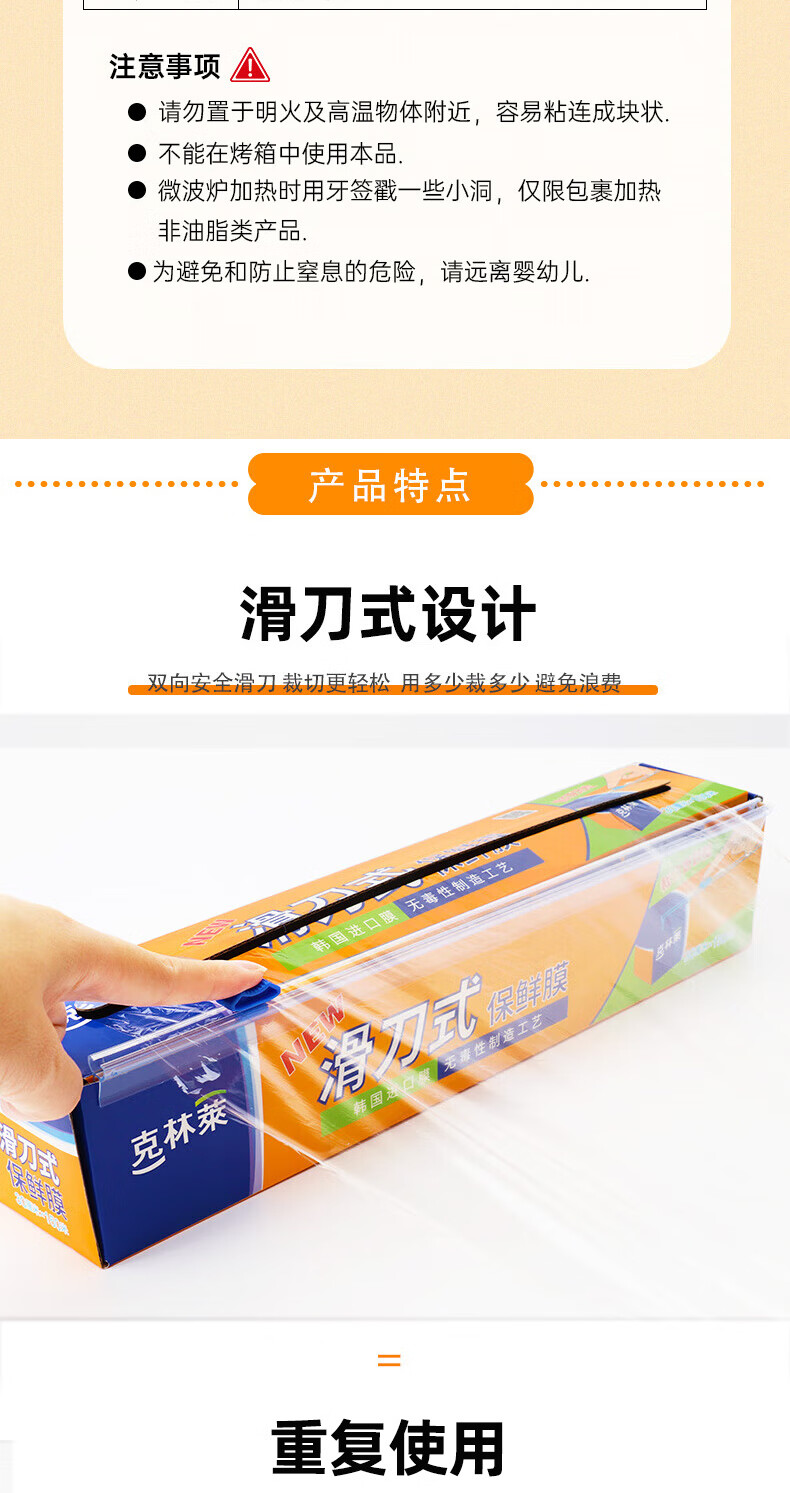 商品名称:(巨邦佑)BJ+克林莱 一次性滑刀式PE进口保鲜膜30cm*150m WHH-1047 盒装大卷带切割器耐高温切割