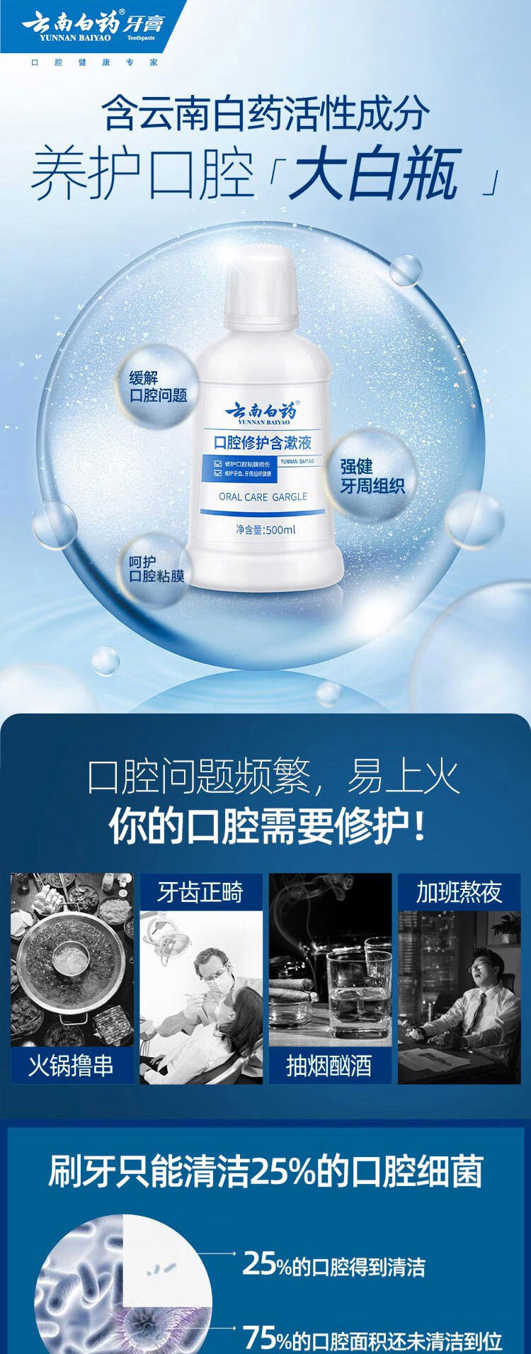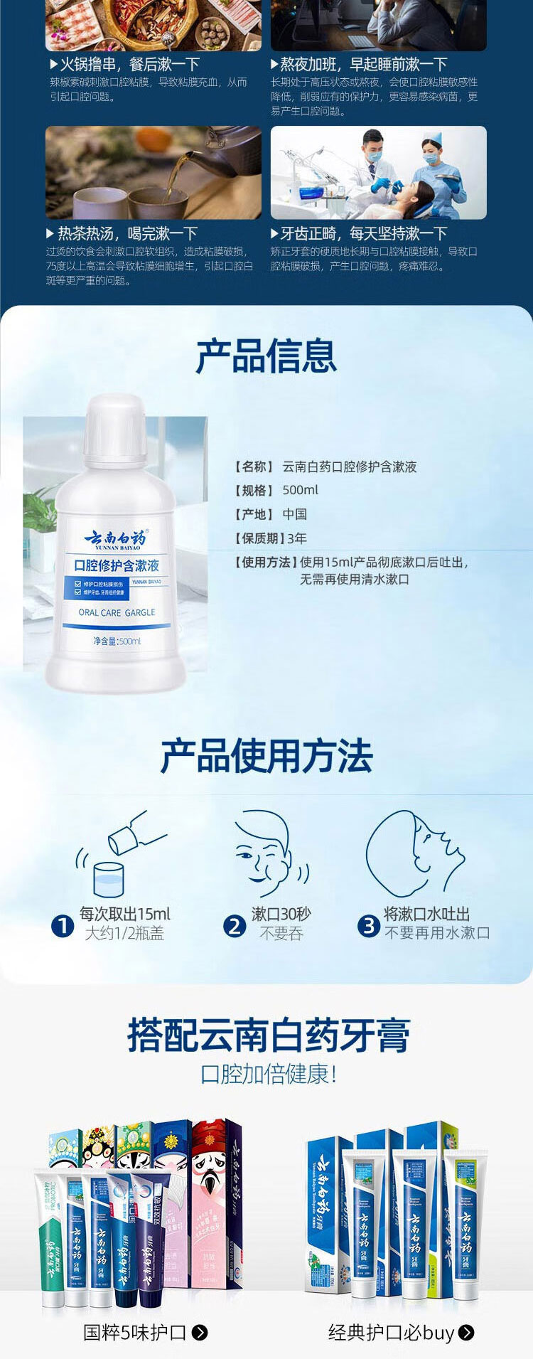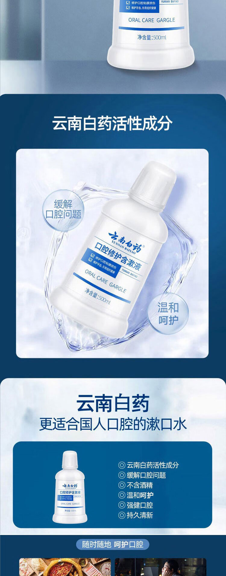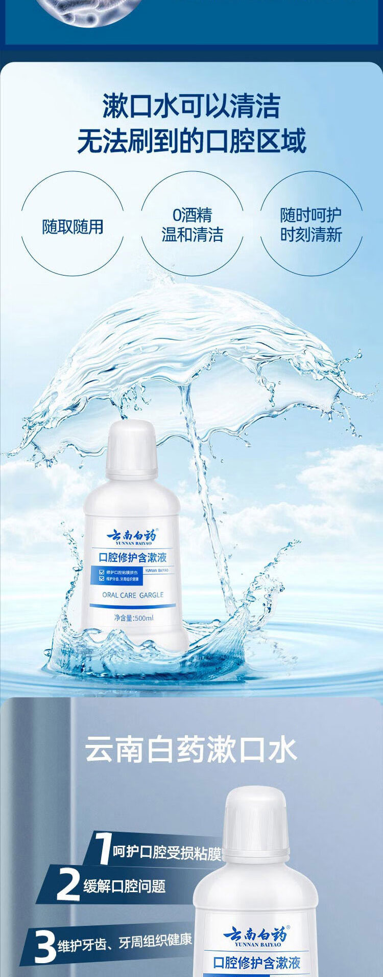 商品名称:(世星阳光)云南白药 口腔修护含漱液 冰柠薄荷500ml 0酒精不辣口清新口气修护口腔粘膜