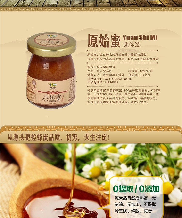 商品名称:(原森堂)神农架原始蜜125克 神农架中华小蜜蜂,百花蜜,无添加,不提取蜂王浆 土蜂蜜的甜度一般在30-50之间,属于微甜